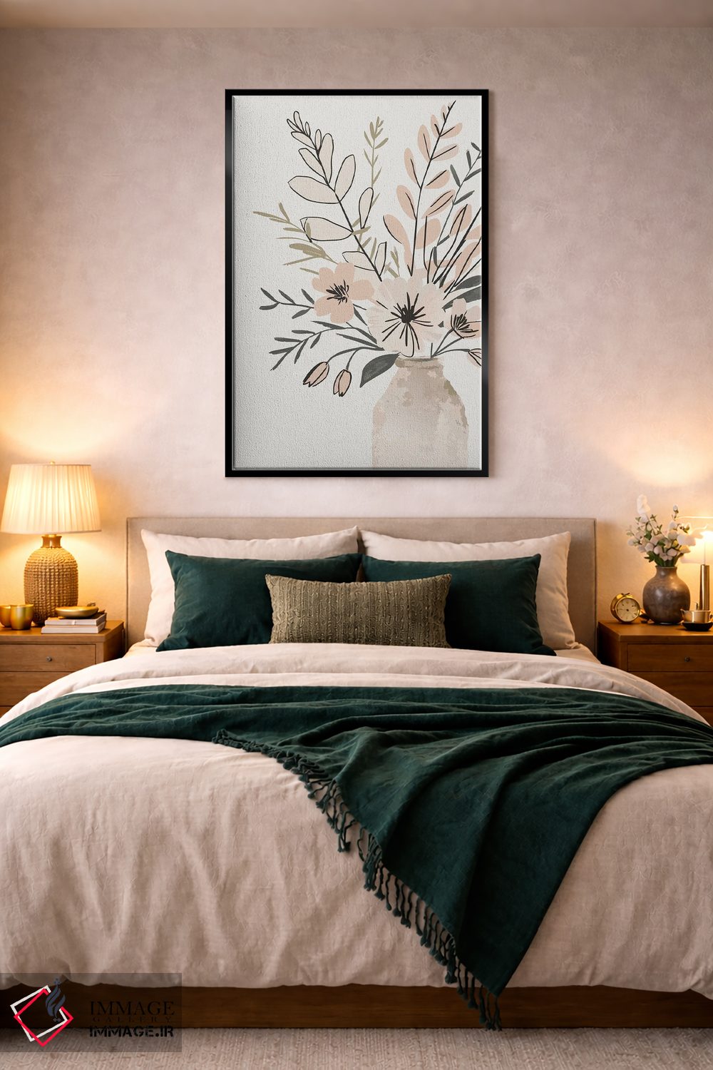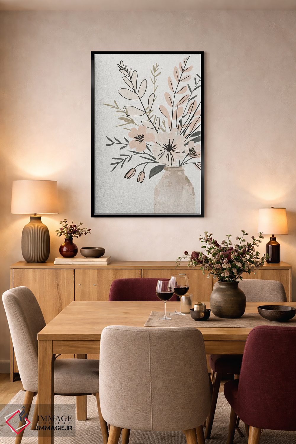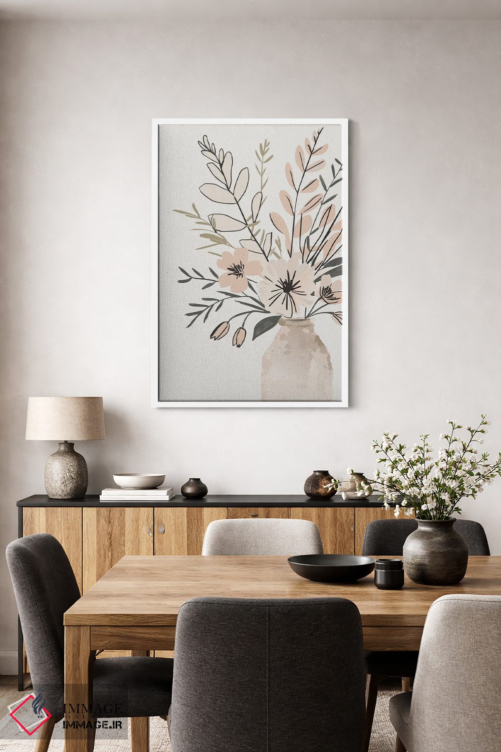 براساس پالت خنثی اثر، قاب بلوط روشن (چوبی) پیشنهاد اول است و استخوانی ملایم مکمل. برای سفارشهای پروژهای با ابعاد و قابهای اختصاصی با ایماژ در تماس باشید.