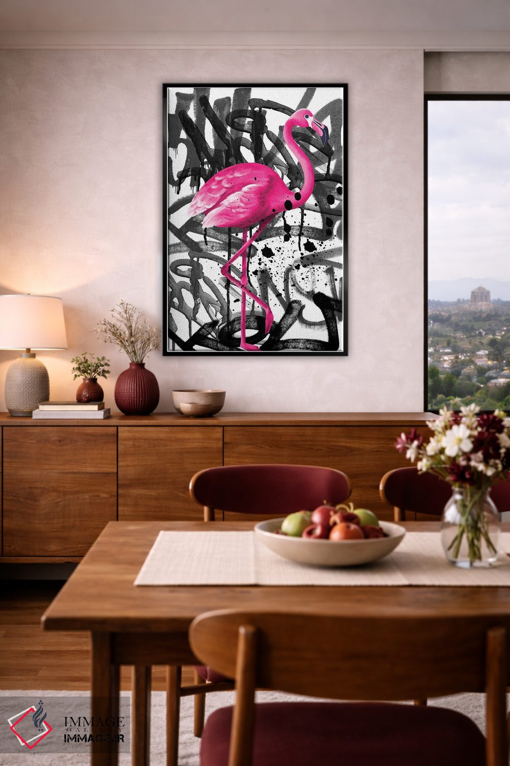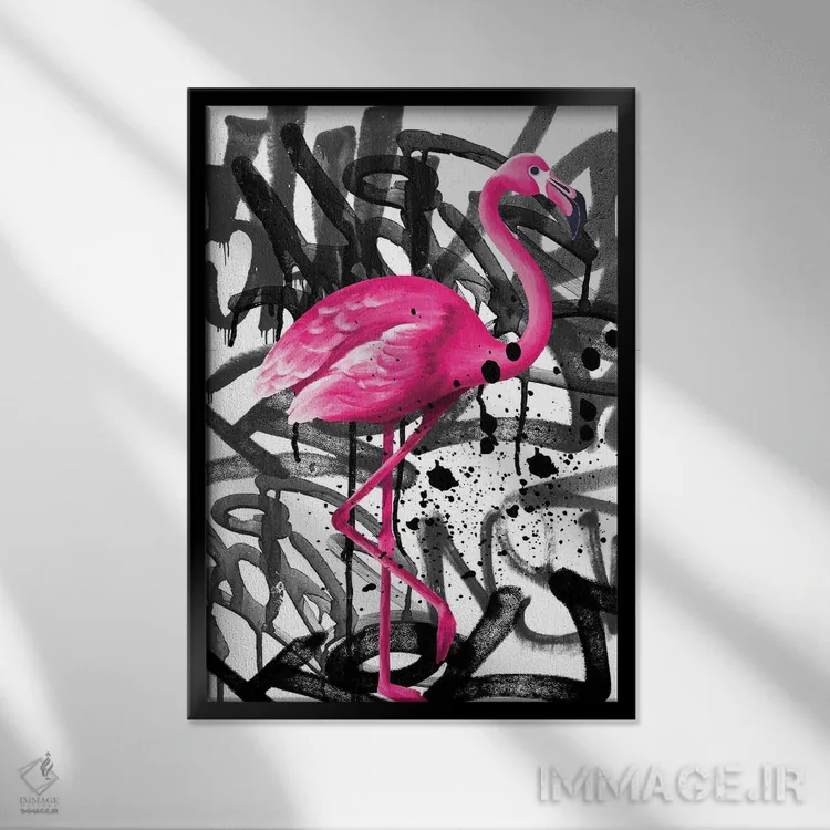 تابلو دکوراتیو هنر خیابانی فلامینگو اثر ادسون راموس - نمای قاب‌دار مشکی
