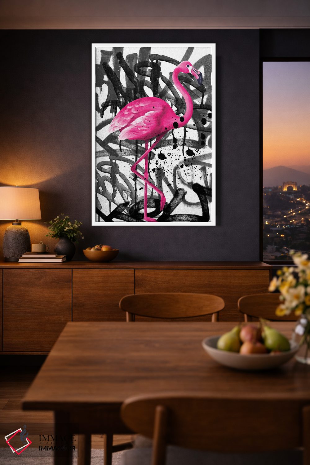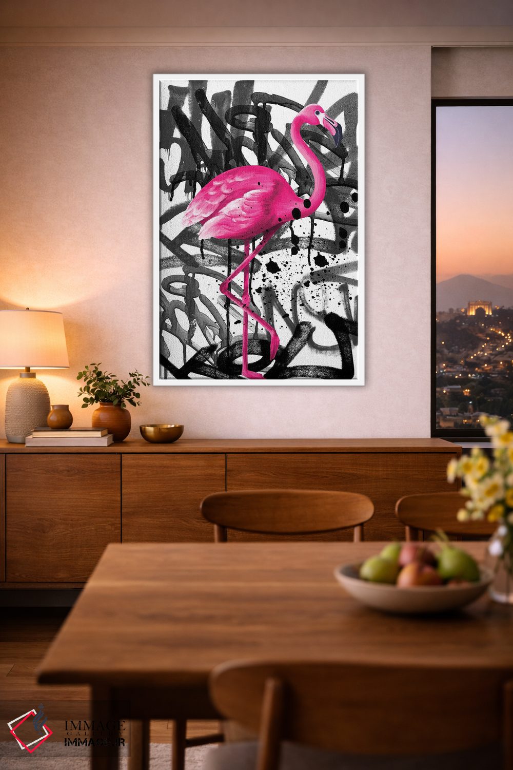 تابلو دکوراتیو هنر خیابانی فلامینگو اثر ادسون راموس - نمای قاب‌دار سفید