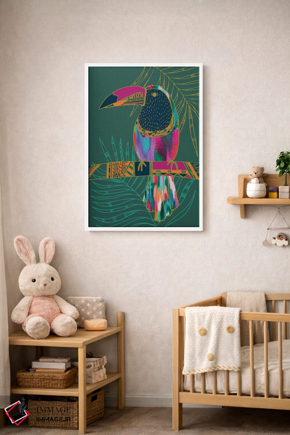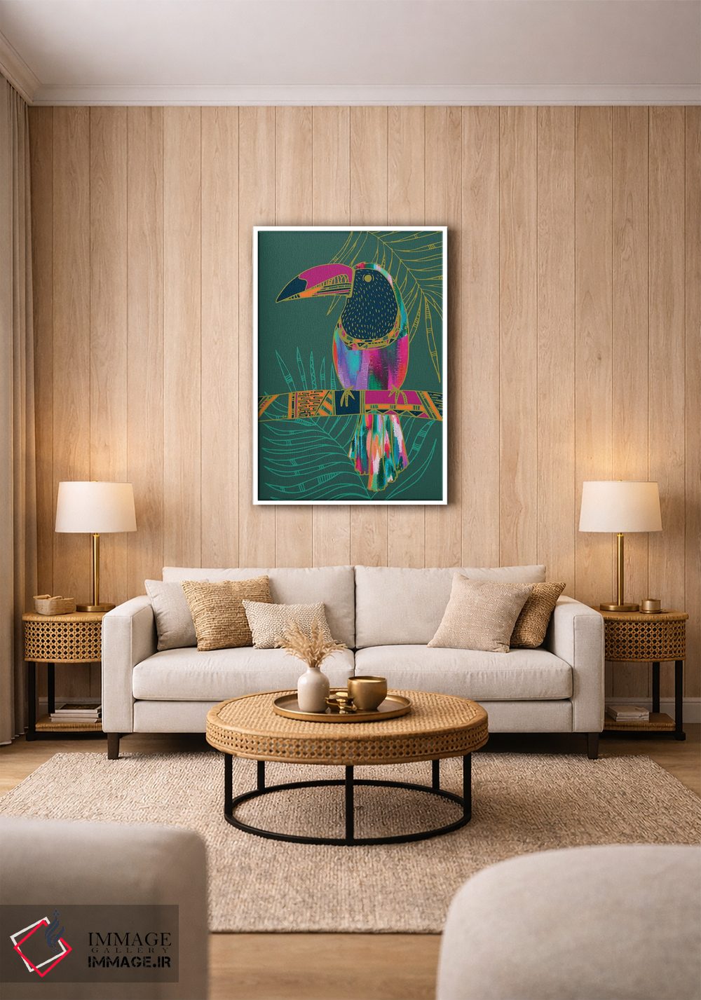 «توکان (پرنده)» اثرِ «اتاوی (برند هنری)» از آن کارهاییست که به فضا، گرمیِ ملایم اضافه میکند؛ برای دکورهایی با رنگهای خنثی انتخاب خوبیست. با نورپردازی نقطهای، جذابتر هم میشود.