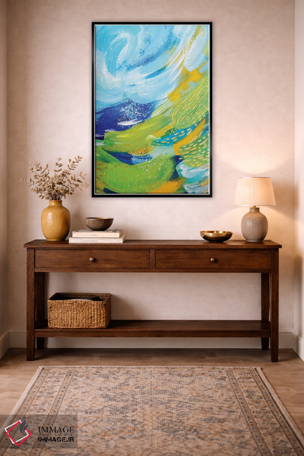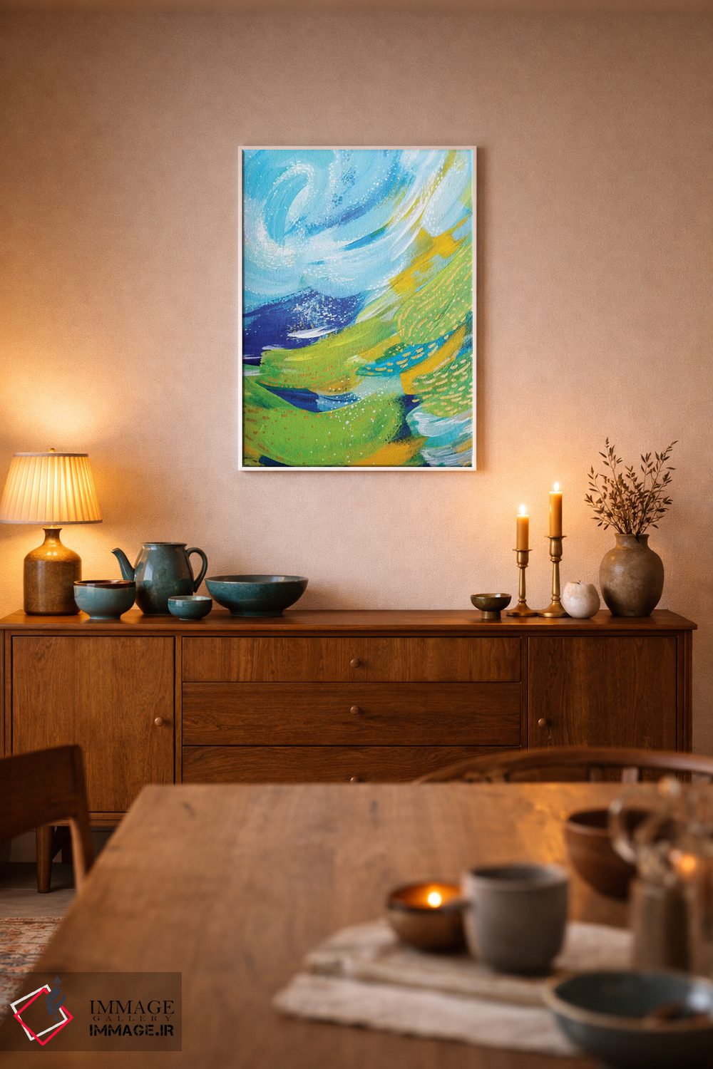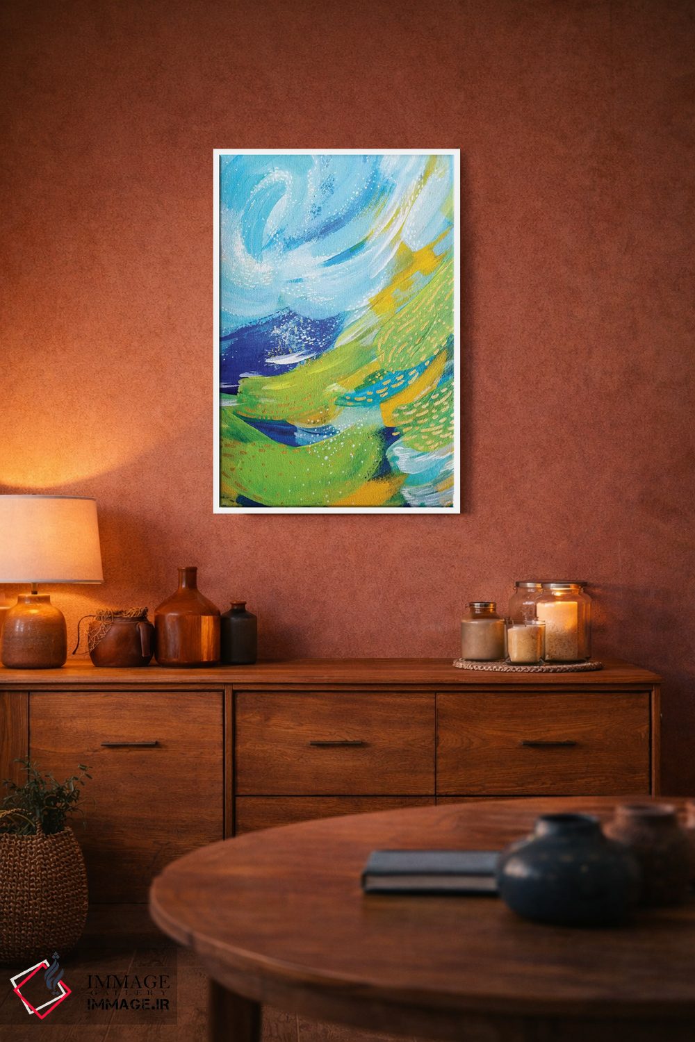 براساس پالت ترکیبی اثر، قاب تیک گرم (چوبی) پیشنهاد اول است و مشکی مات (فریم متوسط) مکمل. برای سفارشهای پروژهای با ابعاد و قابهای اختصاصی با ایماژ در تماس باشید.