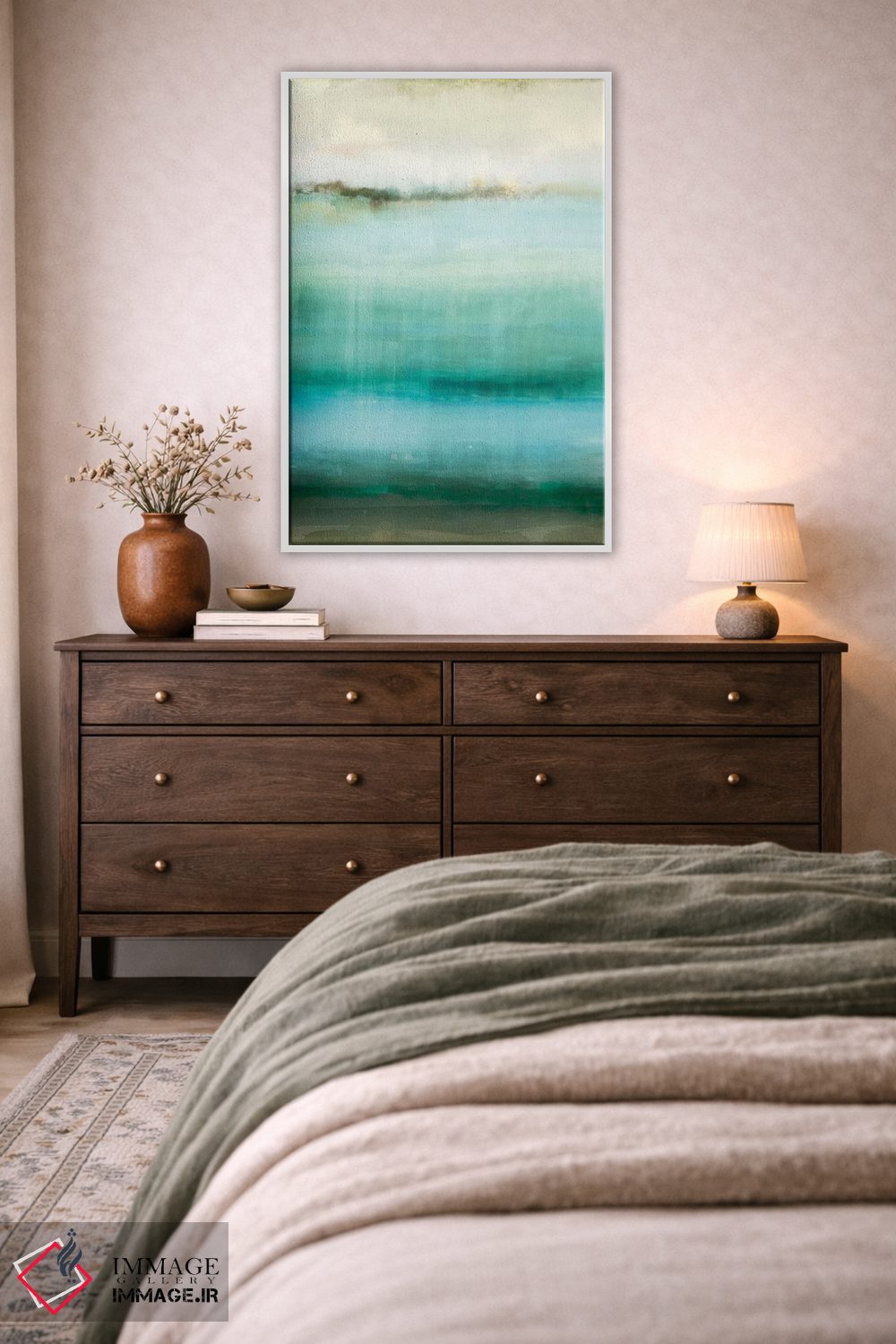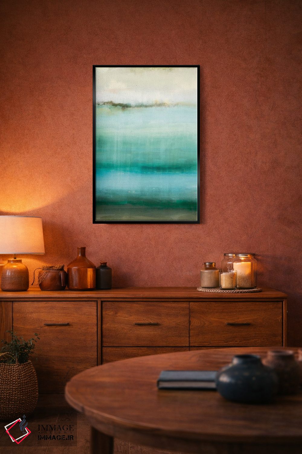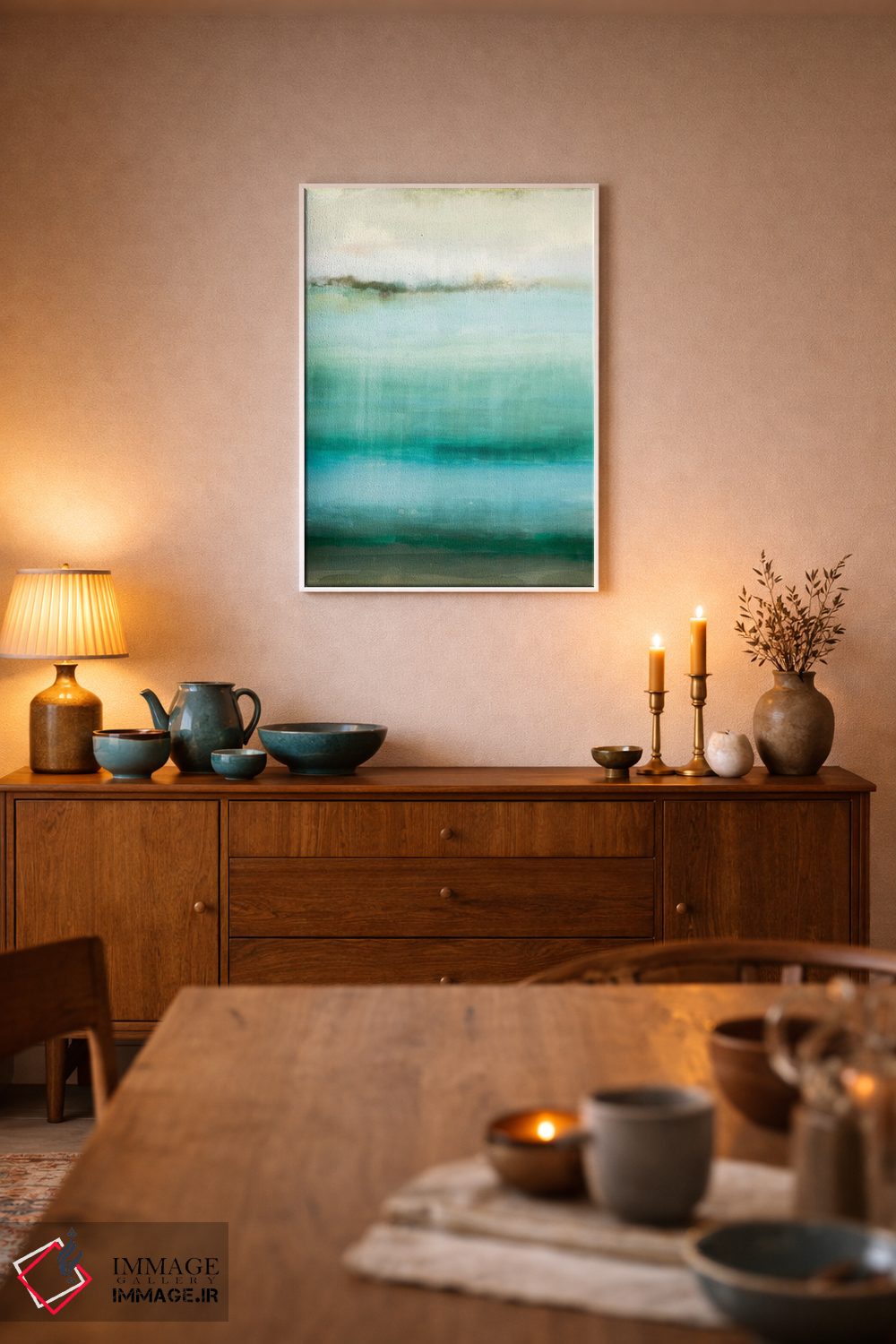 اگر محیط کمینهگرا است، فیروزهای را در رومیزی یا شمعها بهکار ببرید تا حس طراحی فضا کاملتر شود. انتخاب قاب هم میتواند این اکسنت را تقویت کند.