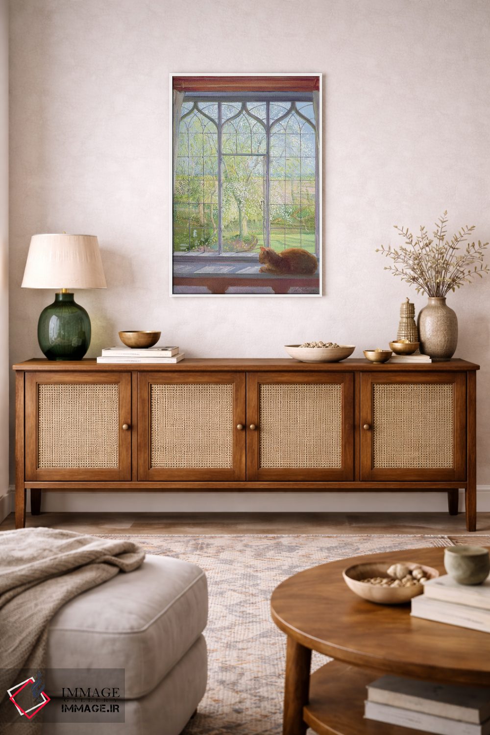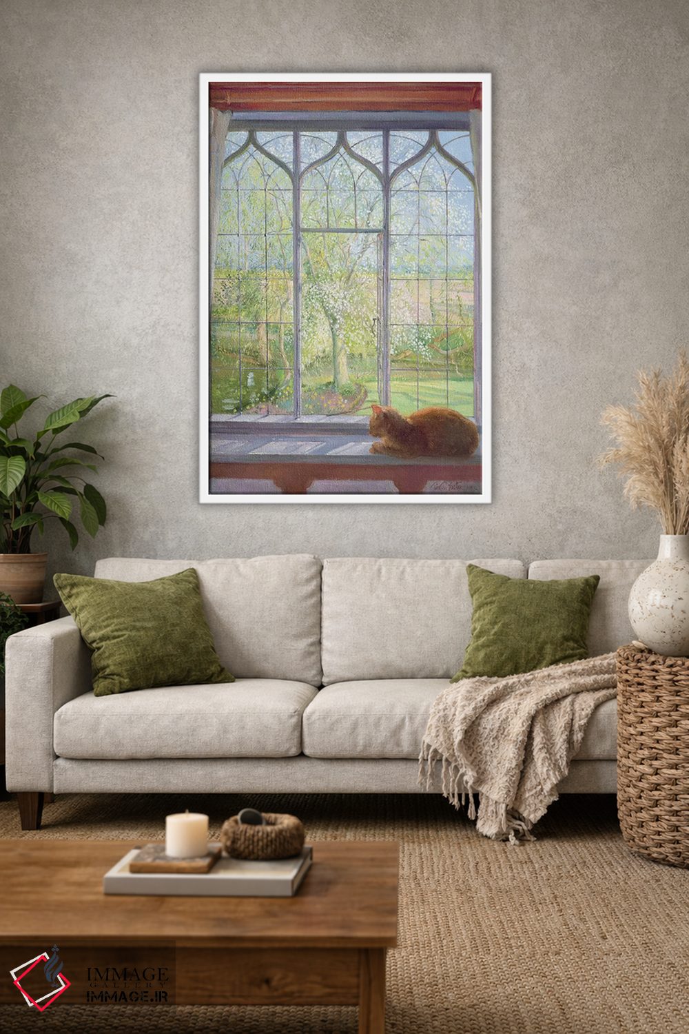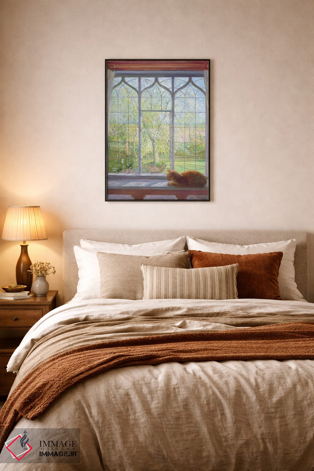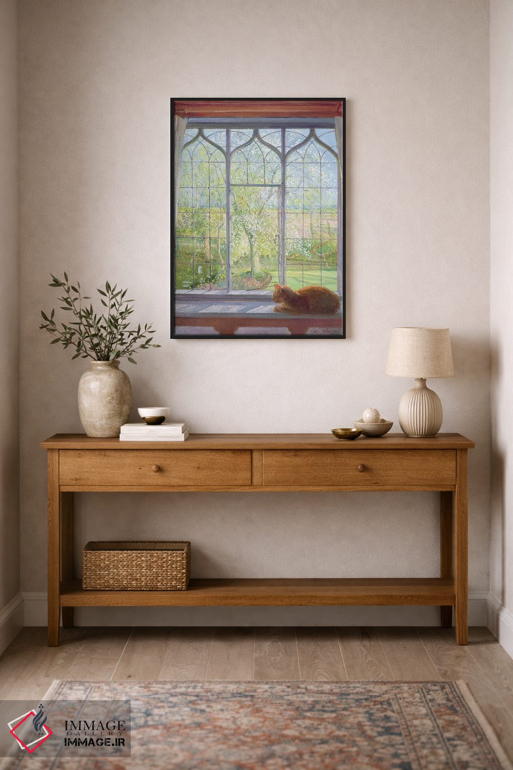براساس پالت ترکیبی اثر، قاب بلوط روشن (چوبی) پیشنهاد اول است و استخوانی ملایم مکمل. برای سفارشهای پروژهای با ابعاد و قابهای اختصاصی با ایماژ در تماس باشید.