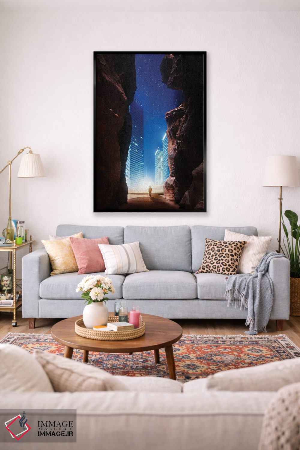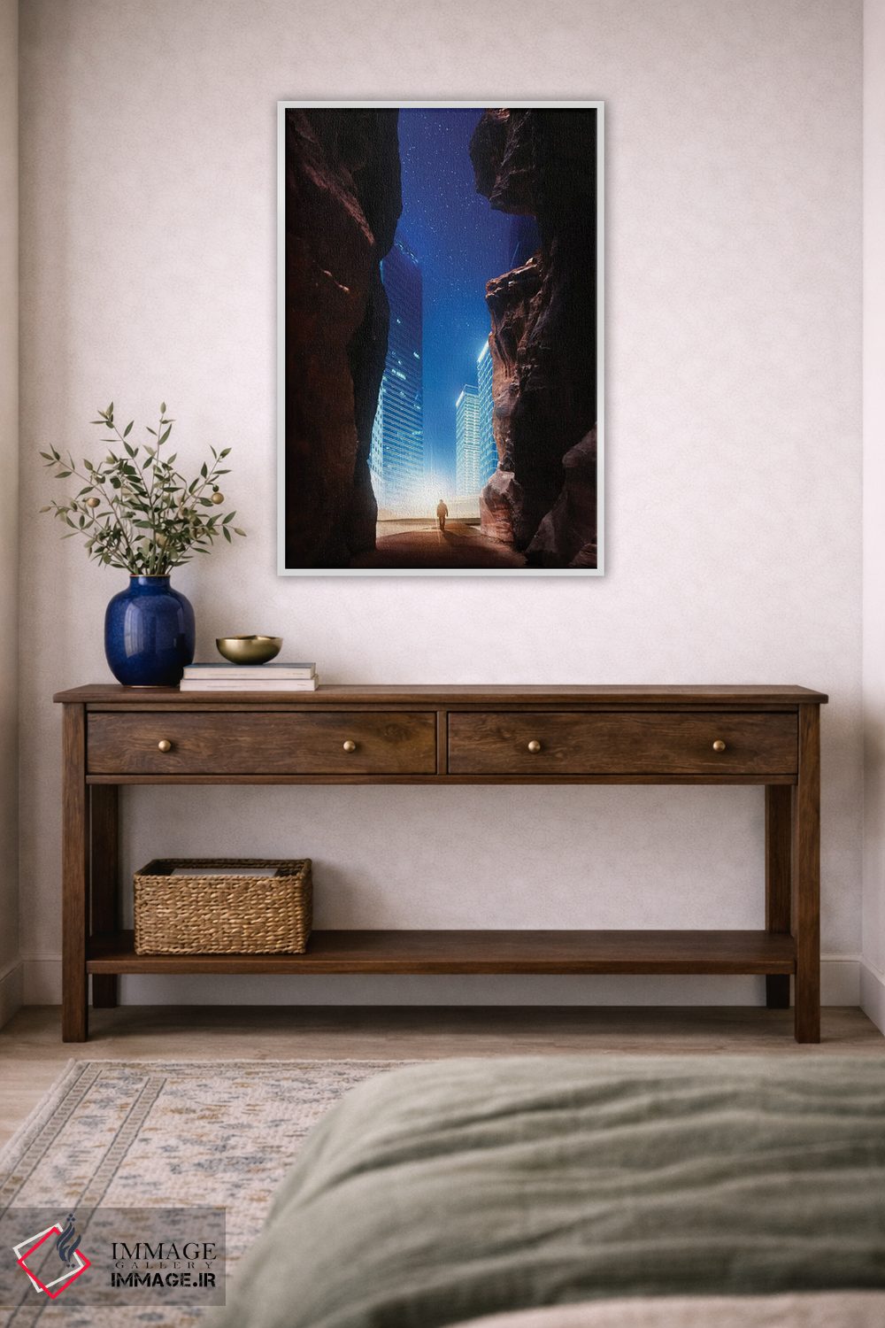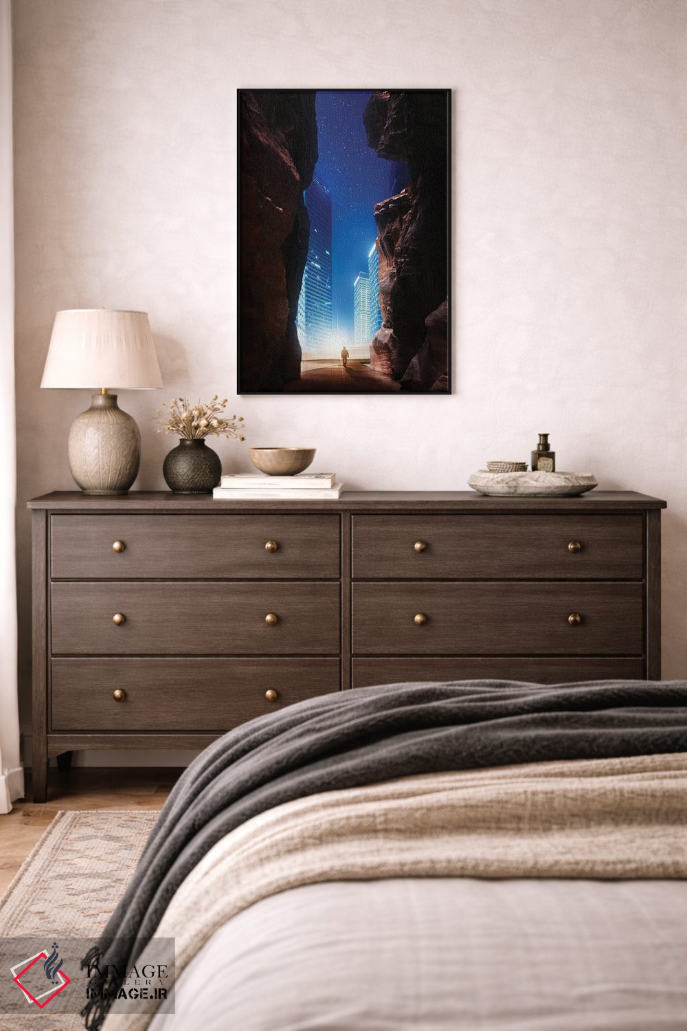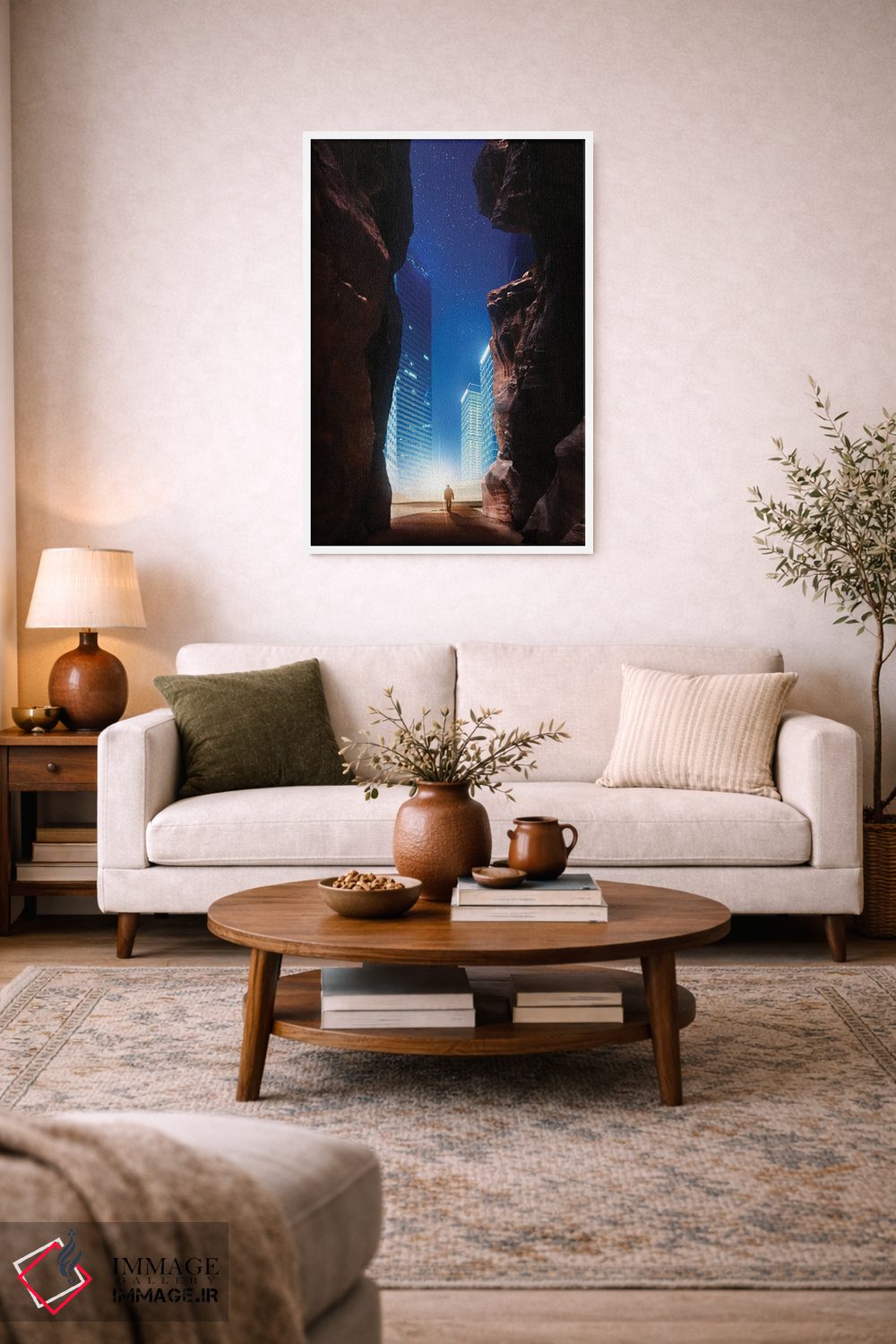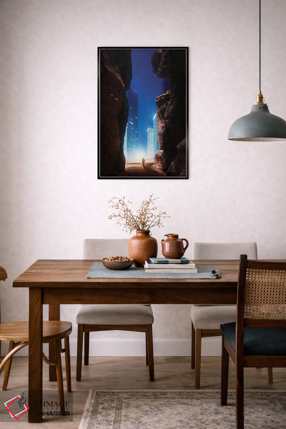 بوم گالری ایماژ نسخهی چیدماناتیوِ گالریپسند از یک اثر هنری است؛ روی کنواس بدون اسید با بافت ظریف و یکنواخت با اجرای چاپ هنری جیکلی (Giclée) برای آرتپرینتهای جدی با رنگدانههای آرشیوی و سیستم رنگ دقیق؛ حس نهایی نزدیکتر به ارائهی گالریوار است؛ نه صرفاً یک تصویر. کلافکشی مرتب و یراق نصب استاندارد، تجربهی نصب را ساده میکند.