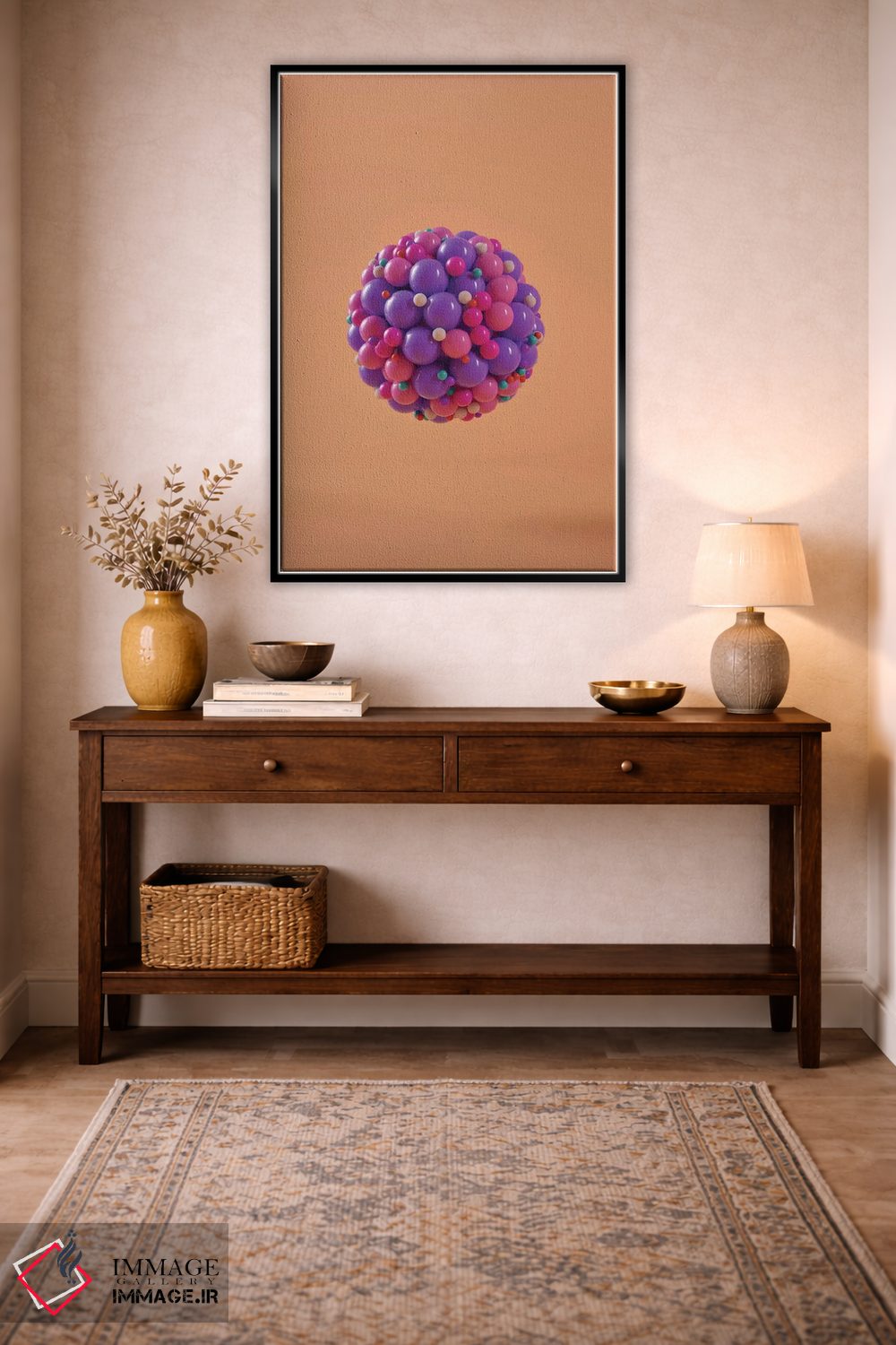 براساس پالت ترکیبی اثر، قاب تیک گرم (چوبی) پیشنهاد اول است و مشکی مات (فریم متوسط) مکمل. برای سفارشهای پروژهای با ابعاد و قابهای اختصاصی با ایماژ در تماس باشید.