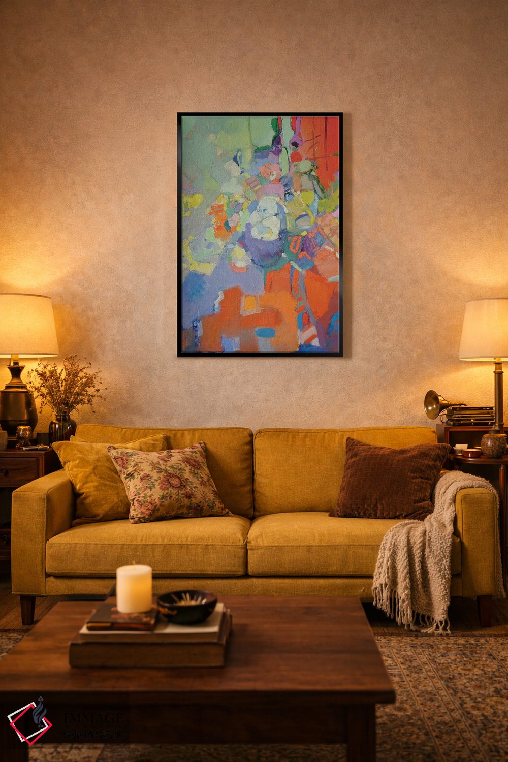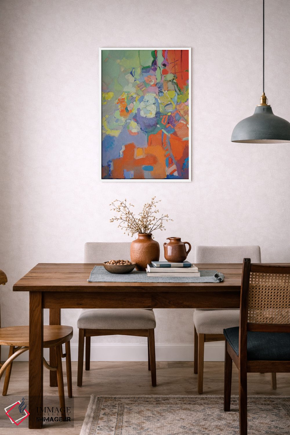 براساس پالت ترکیبی اثر، قاب تیک گرم (چوبی) پیشنهاد اول است و مشکی مات (فریم متوسط) مکمل. برای سفارشهای پروژهای با ابعاد و قابهای اختصاصی با ایماژ در تماس باشید.