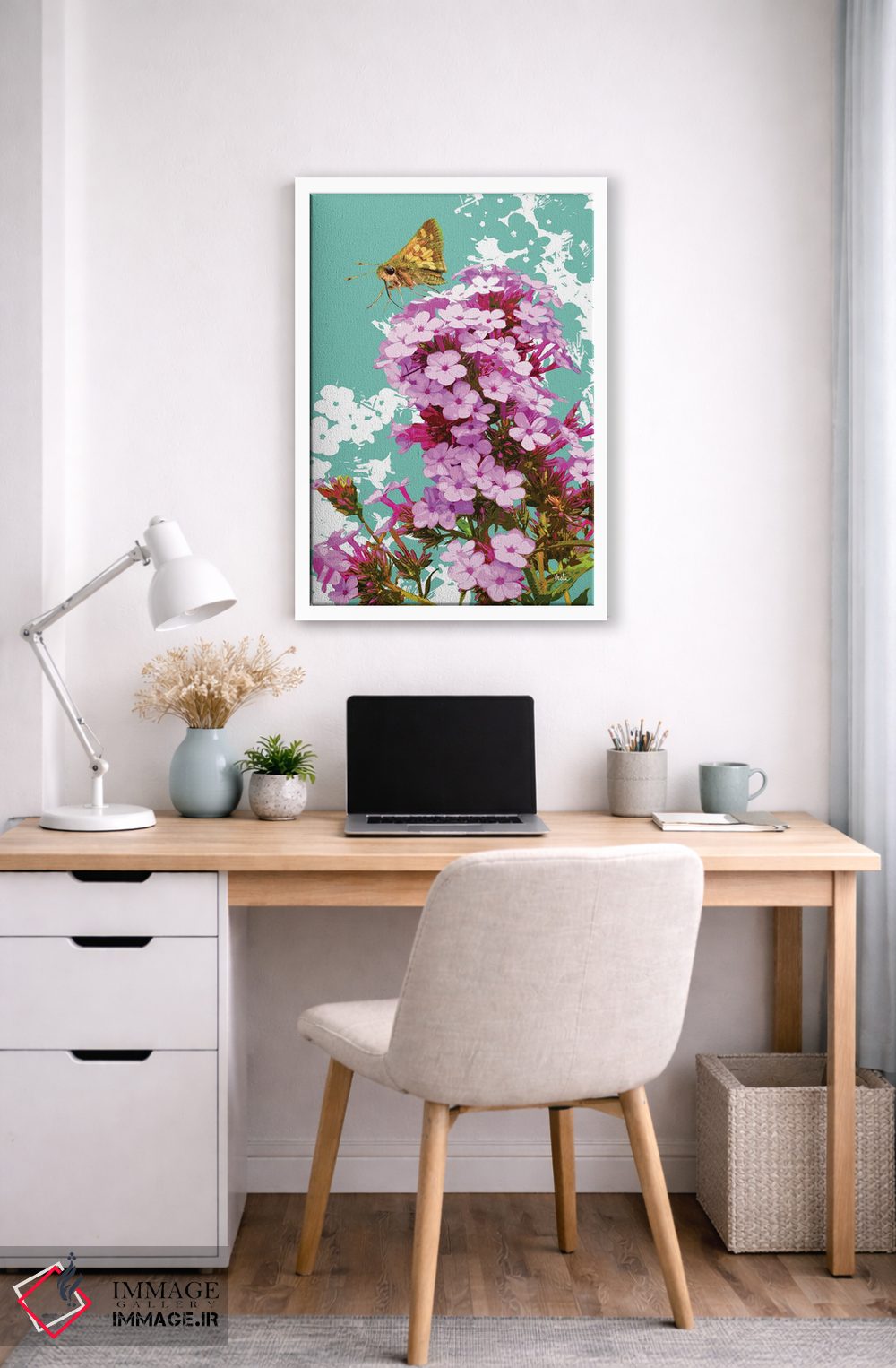 تابلو دکوراتیو پروانه اسکیپر روی گل فلوکس اثر اولیا دیزاینز - نمای قاب‌دار سفید