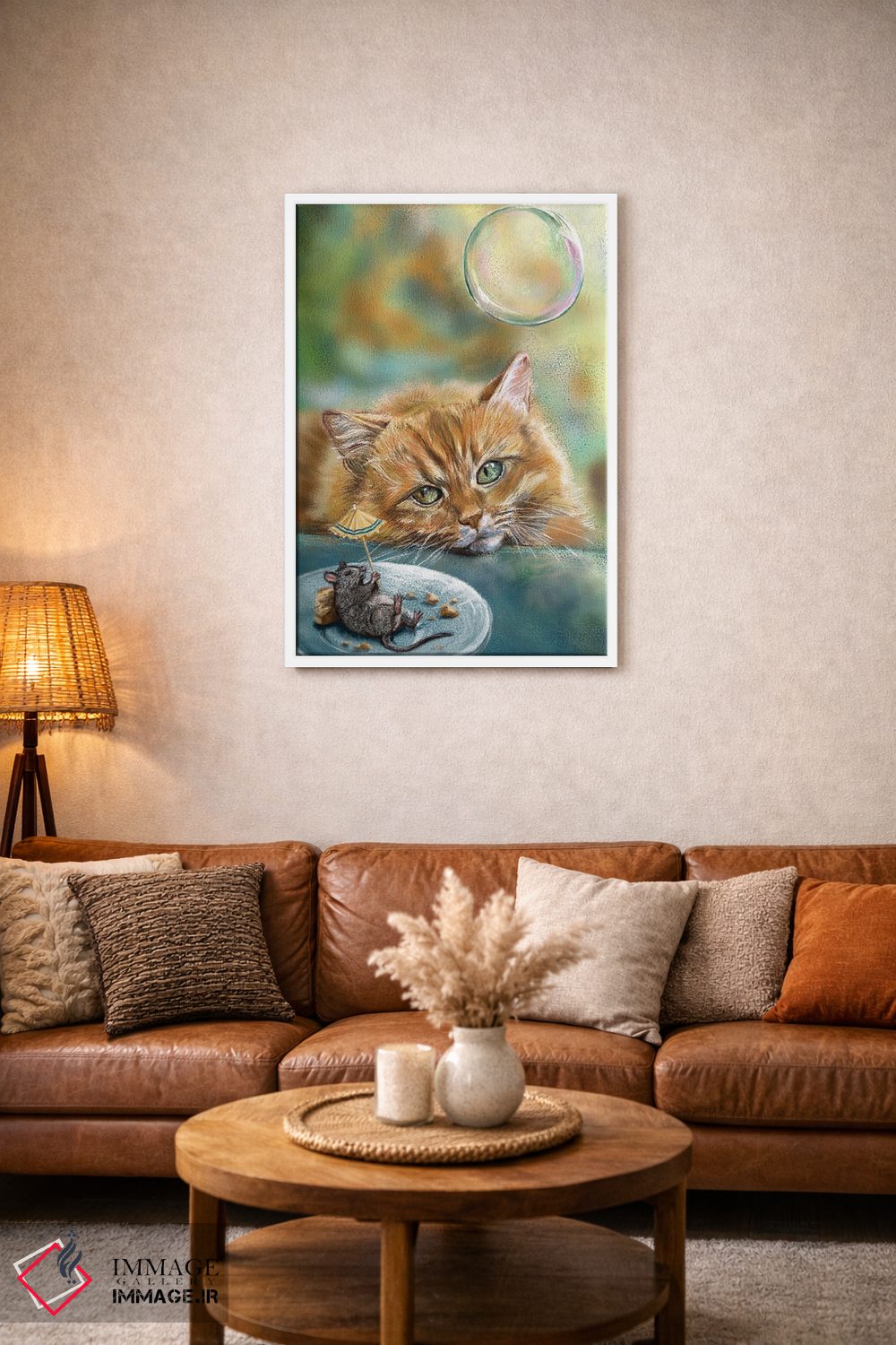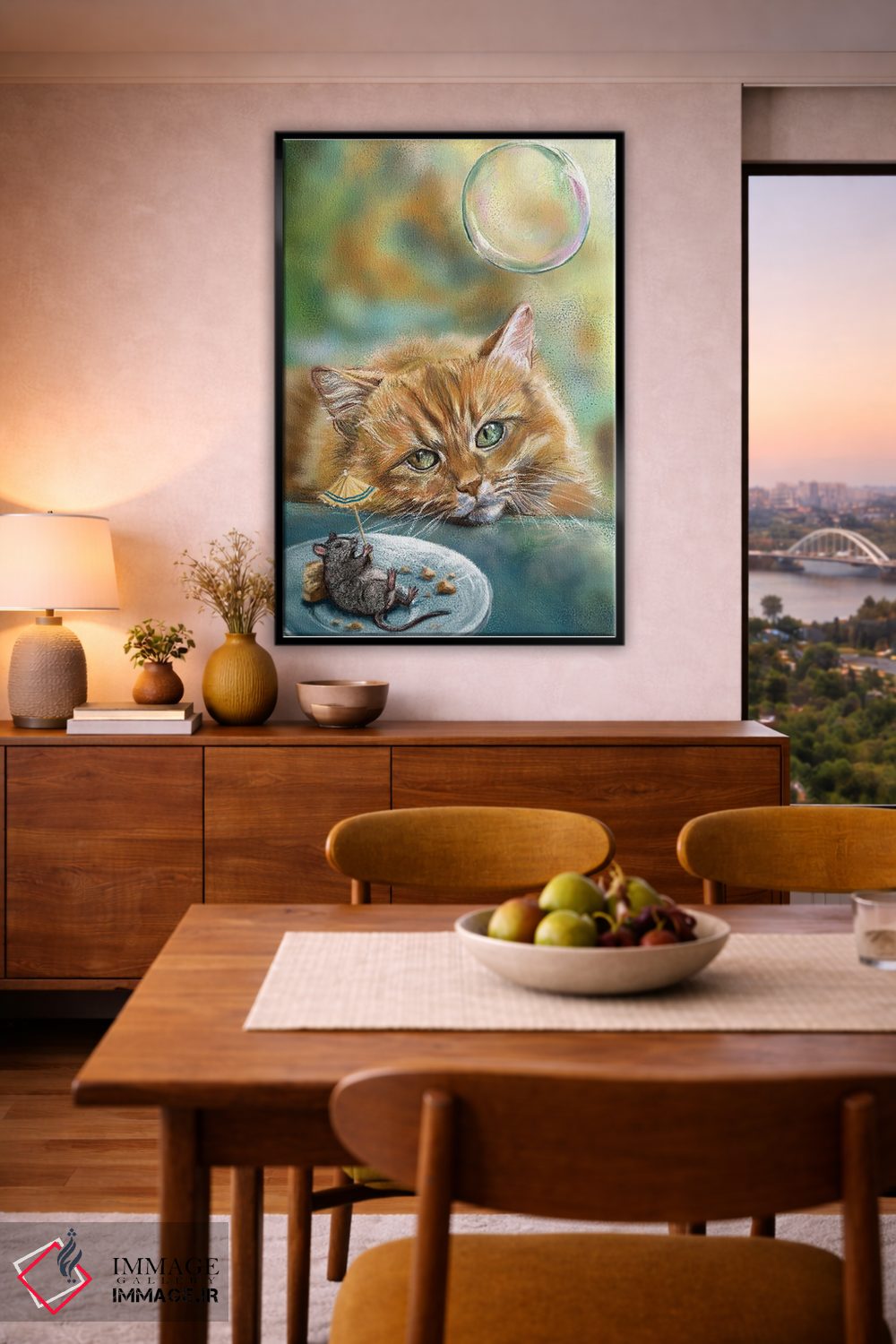 برای دکورهای صمیمی، «گربهٔ رویایی» اثرِ «آناستازیا اِوگرافوا» بافت و جزئیات را طوری نشان میدهد که نگاه میماند؛ برای کافههای کوچک و صمیمی انتخابی خوشسلیقه است. هم فضا را گرم میکند، هم شلوغش نمیکند.