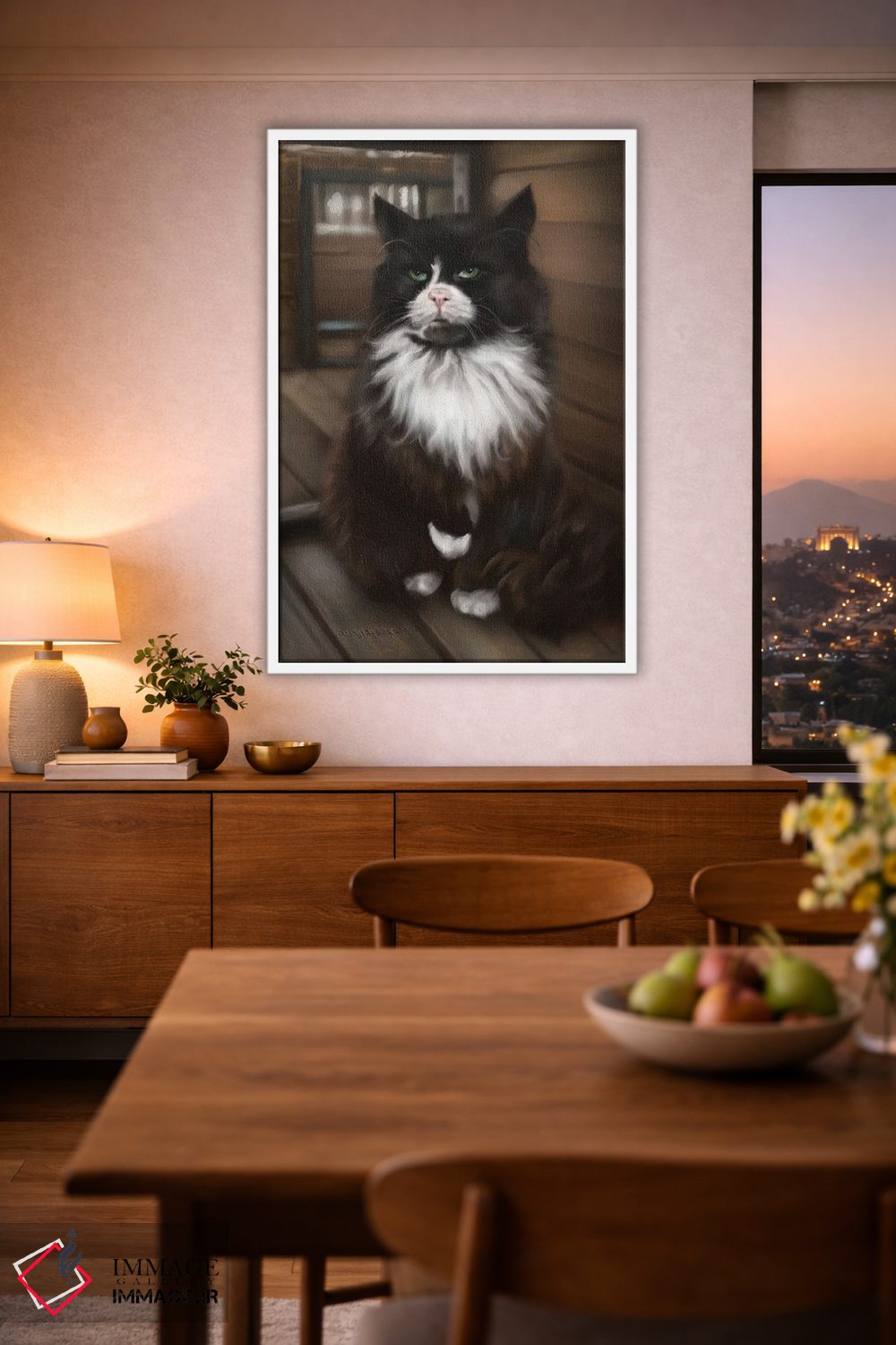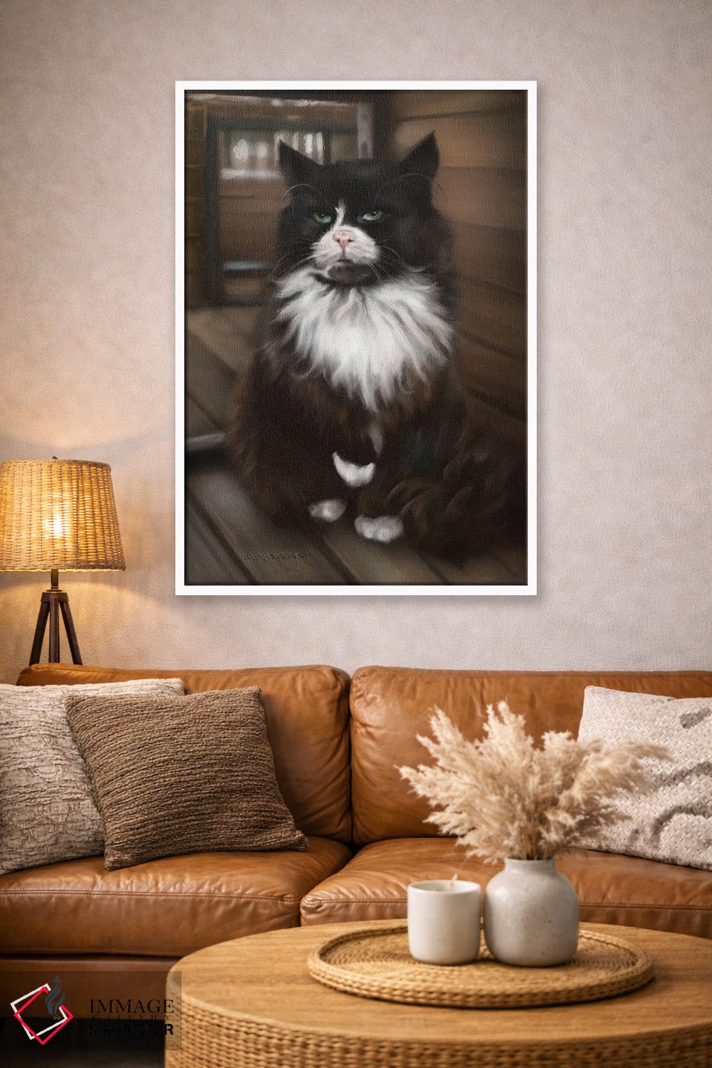براساس پالت گرم اثر، قاب بلوط روشن (چوبی) پیشنهاد اول است و استخوانی ملایم مکمل. برای سفارشهای پروژهای با ابعاد و قابهای اختصاصی با ایماژ در تماس باشید.