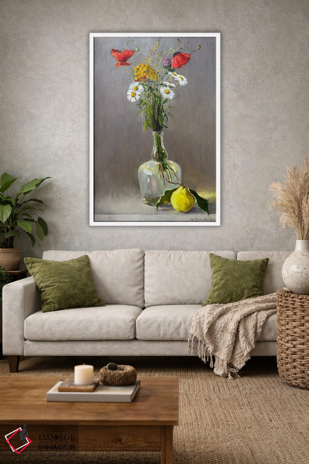 براساس پالت ترکیبی اثر، قاب بلوط روشن (چوبی) پیشنهاد اول است و استخوانی ملایم مکمل. برای سفارشهای پروژهای با ابعاد و قابهای اختصاصی با ایماژ در تماس باشید.