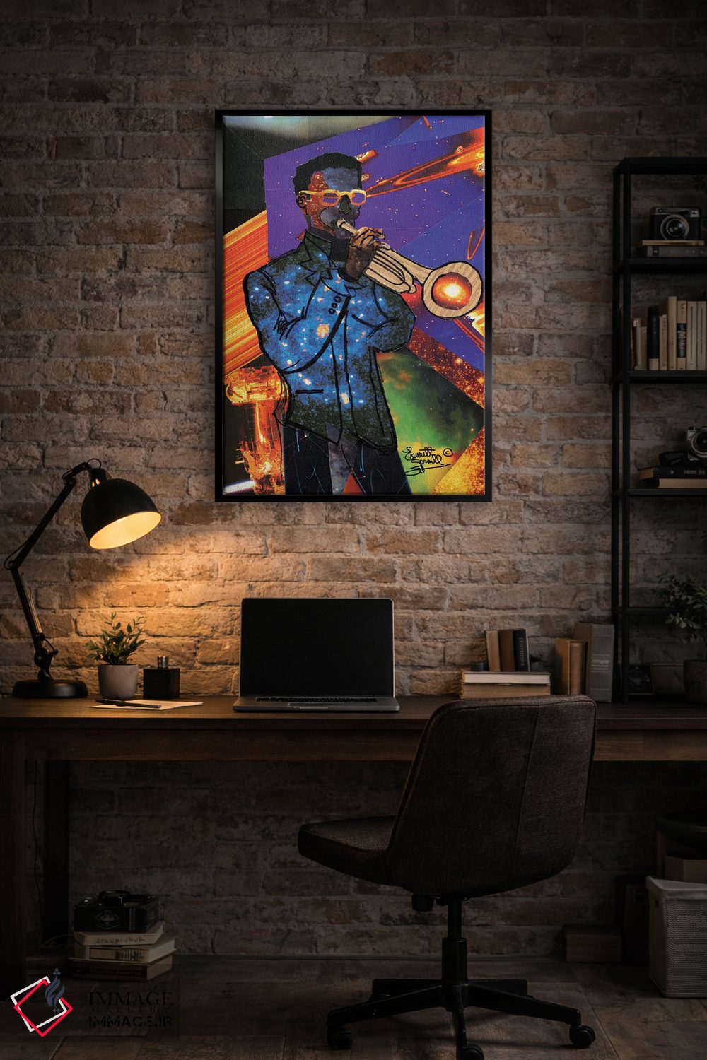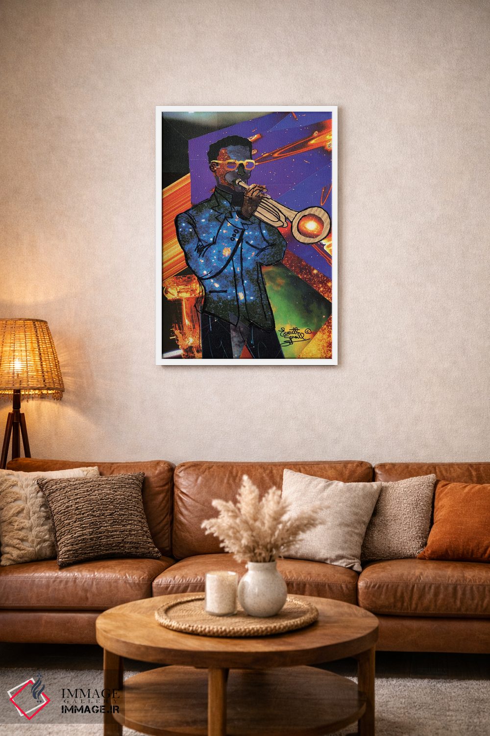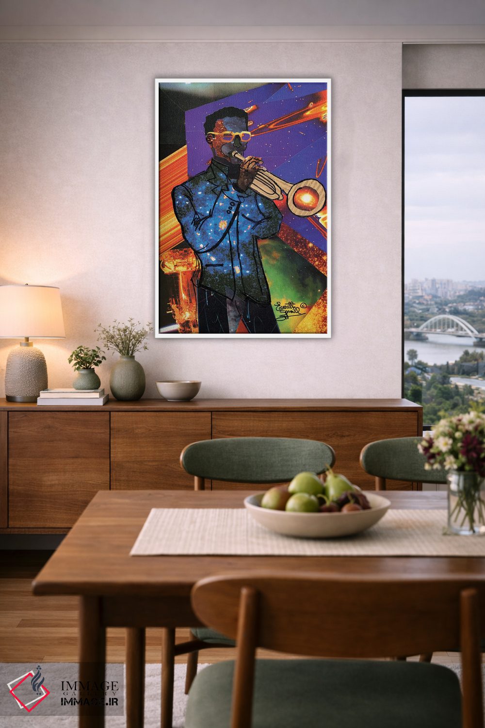 براساس پالت ترکیبی اثر، قاب تیک گرم (چوبی) پیشنهاد اول است و مشکی مات (فریم متوسط) مکمل. برای سفارشهای پروژهای با ابعاد و قابهای اختصاصی با ایماژ در تماس باشید.