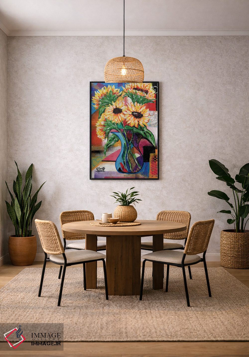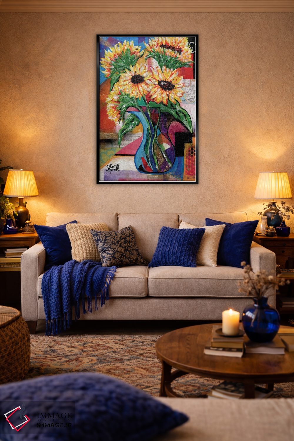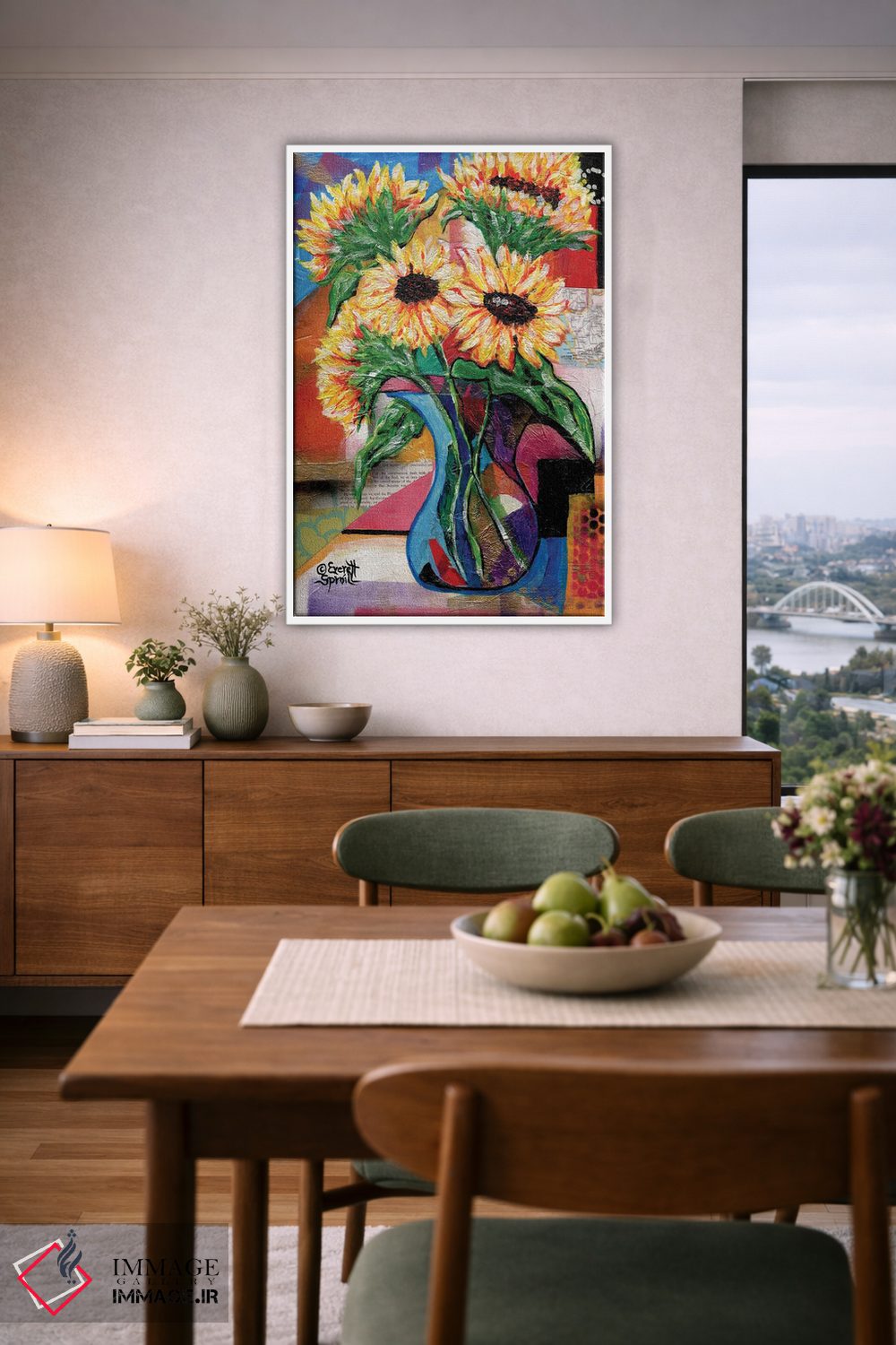 برای دیواری که میخواهید نرمتر دیده شود، «آفتابگردانها برای آنتونیو» اثرِ «اورِت اسپرویل» حس فصل را آرام وارد فضا میکند؛ برای نشیمنهای روشن انتخابی خوشسلیقه است. برای دیوار گالری هم ترکیبپذیر و خوشنشین است.