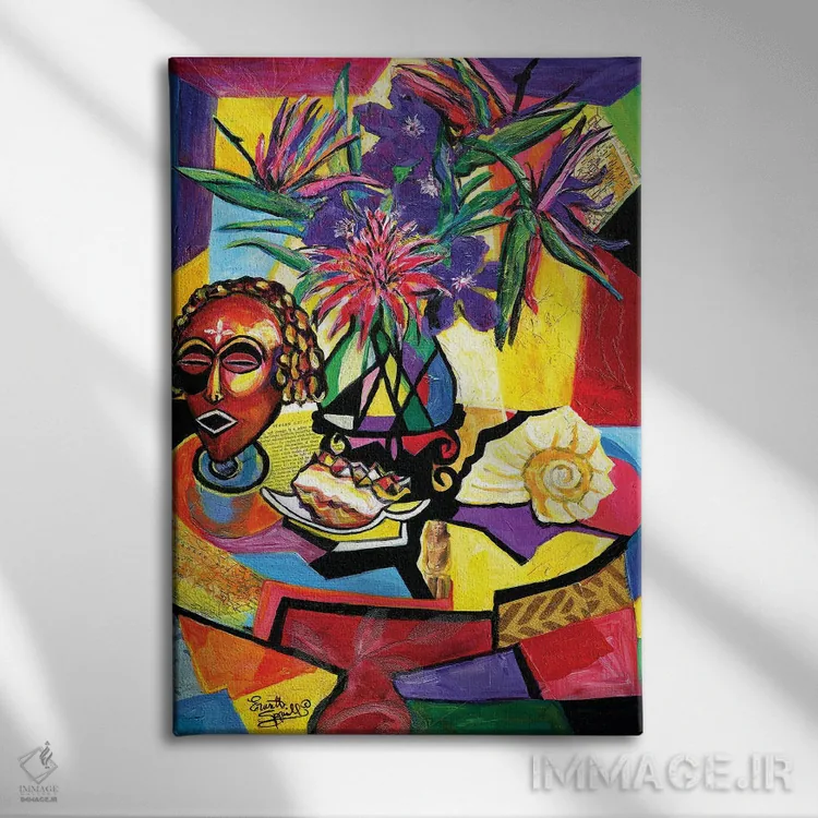 این تابلو تزئینی با موضوعِ این اثر برای هدیه و دکورهای روشن همیشه جواب میدهد: «طبیعت بیجان با نقاب، صدف و گلآرایی» اثرِ «اورِت اسپرویل».