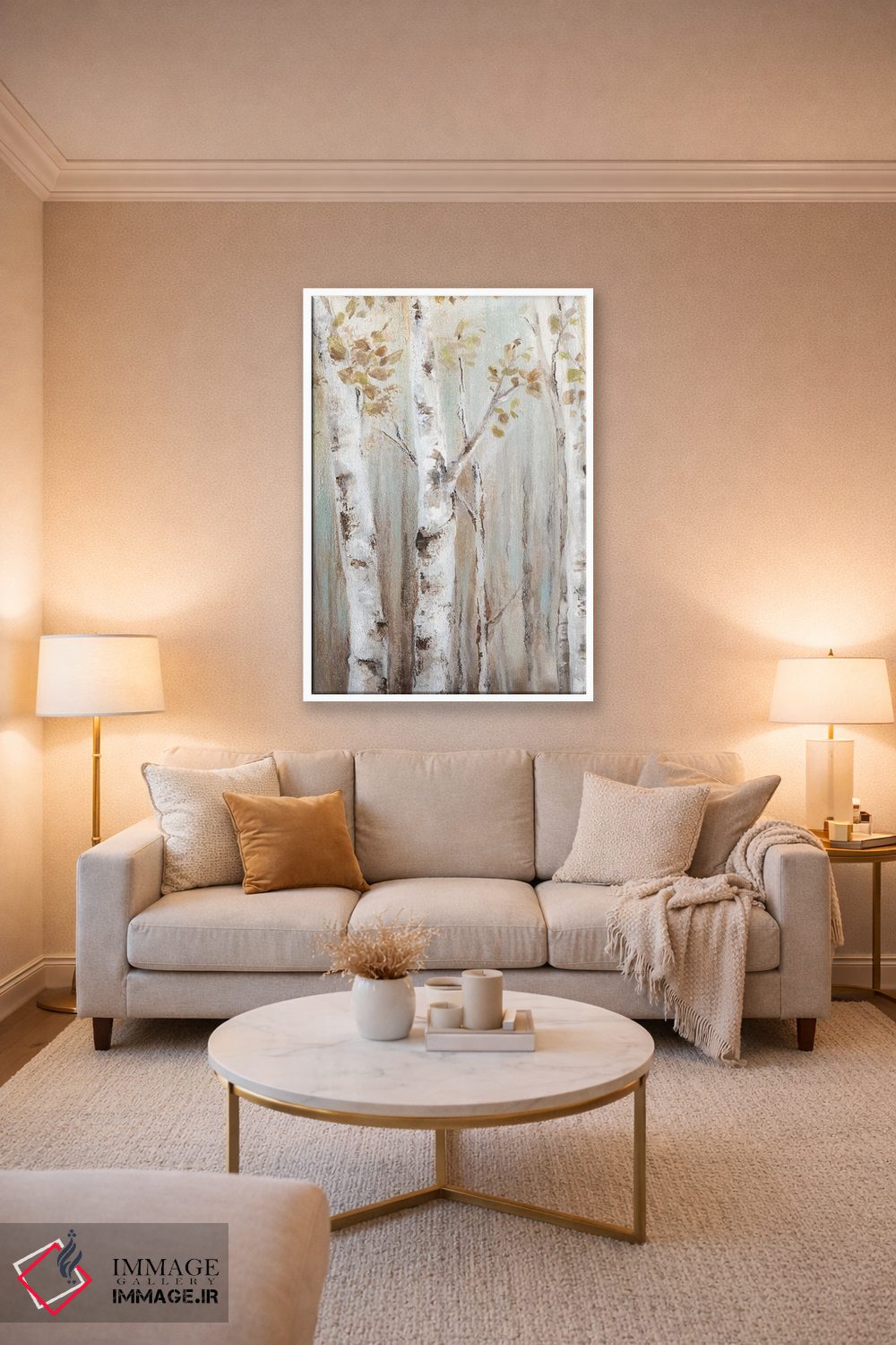 براساس پالت گرم اثر، قاب بلوط روشن (چوبی) پیشنهاد اول است و استخوانی ملایم مکمل. برای سفارشهای پروژهای با ابعاد و قابهای اختصاصی با ایماژ در تماس باشید.