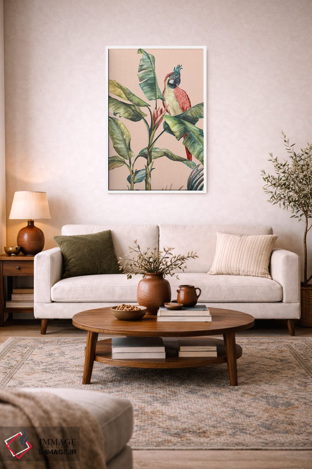 «تروپیکانو II» اثرِ «اوا واتس» از آن کارهاییست که به فضا، گرمیِ ملایم اضافه میکند؛ برای نشیمنهای خانوادگی انتخاب خوبیست. به دیوار، قصه میدهد—اما قصهای آرام و شیک.