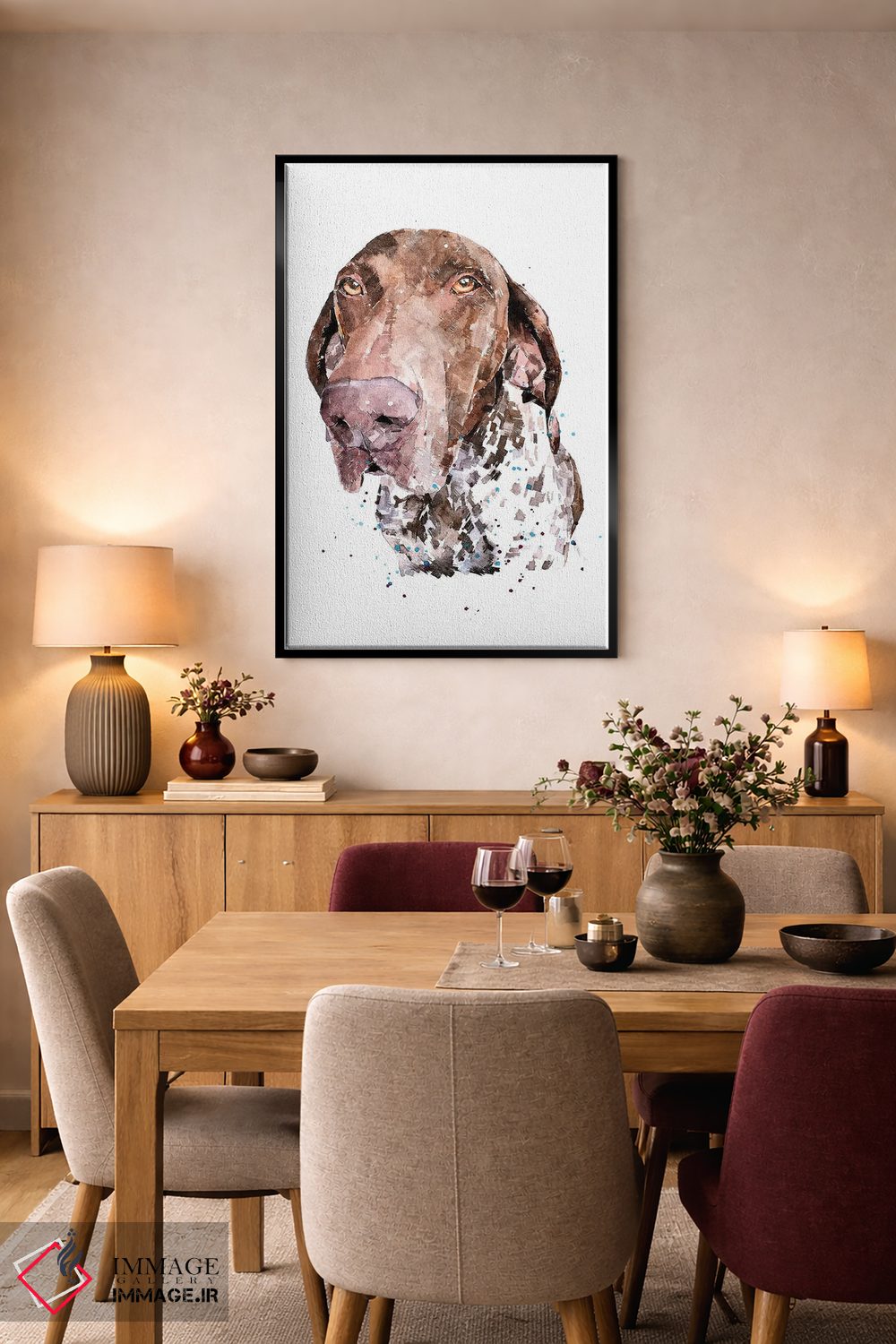 برای دکورهای صمیمی، «جی.اس.پی ۱ (اشاره به سگ اشارهگر کوتاهمو آلمانی)» اثرِ «ادز واترکالرز (برند نقاشی آبرنگ)» بافت و جزئیات را طوری نشان میدهد که نگاه میماند؛ برای نشیمنهای خانوادگی انتخابی خوشسلیقه است. با نورپردازی نقطهای، جذابتر هم میشود.