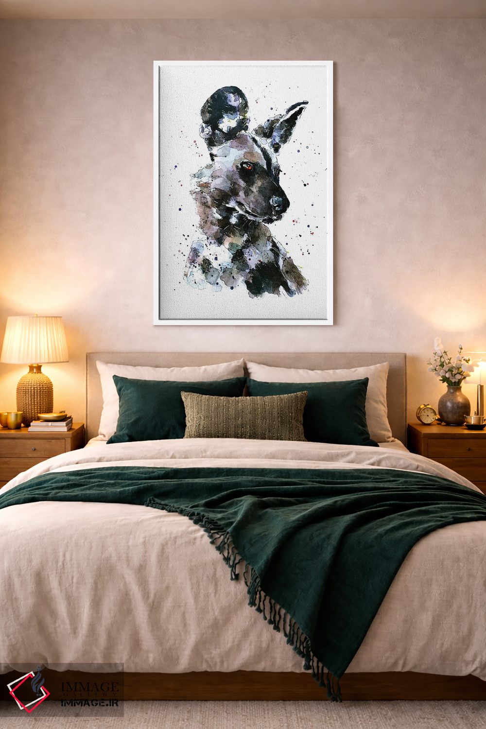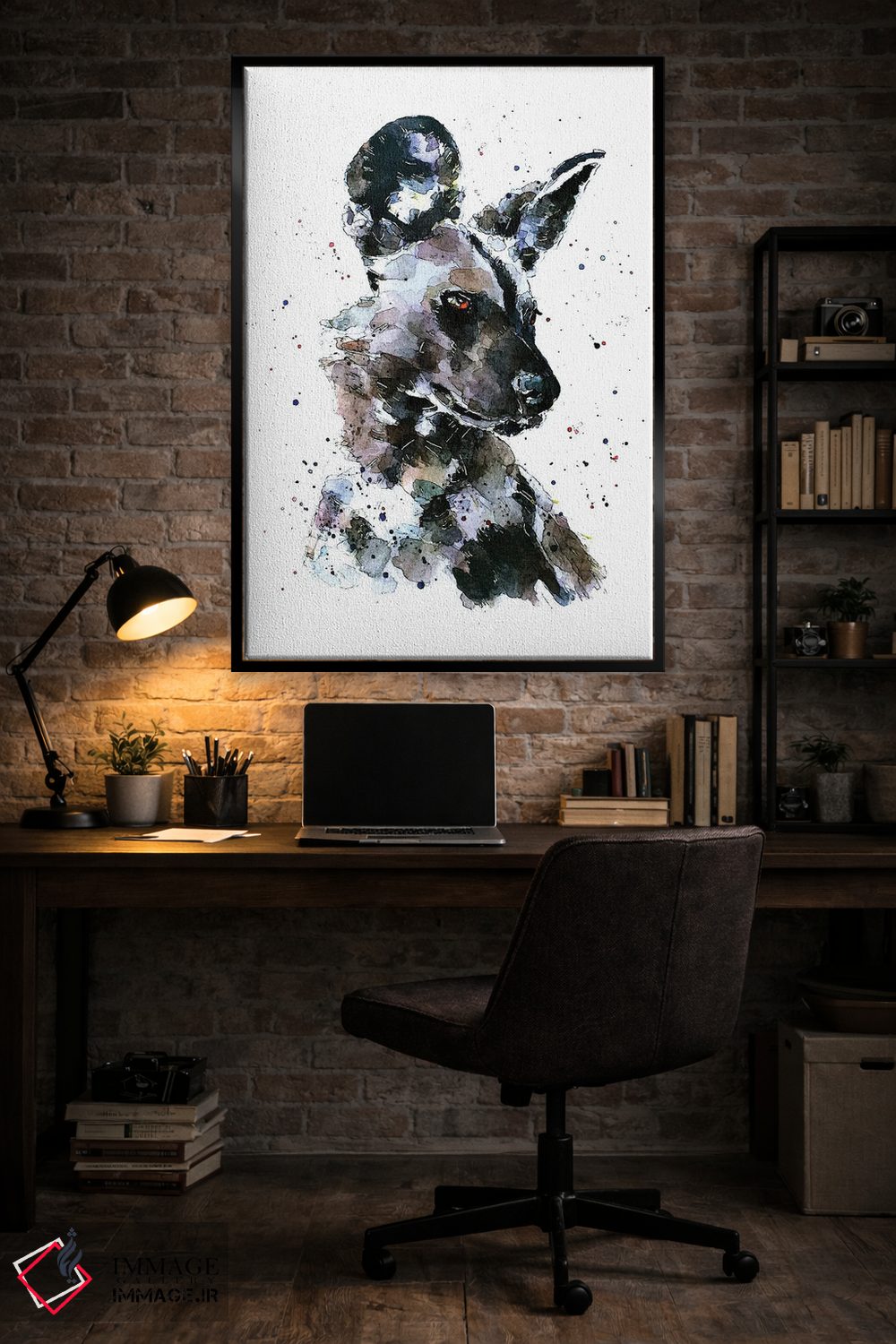 «سگ وحشی آفریقایی پر زرق و برق» اثرِ «ادز واترکالرز (برند نقاشی آبرنگ)» از آن کارهاییست که در کنار رنگهای خنثی، تضاد دلچسبی میسازد؛ برای اتاق بازی یا گوشهٔ مطالعه انتخاب خوبیست. به دیوار، قصه میدهد—اما قصهای آرام و شیک.