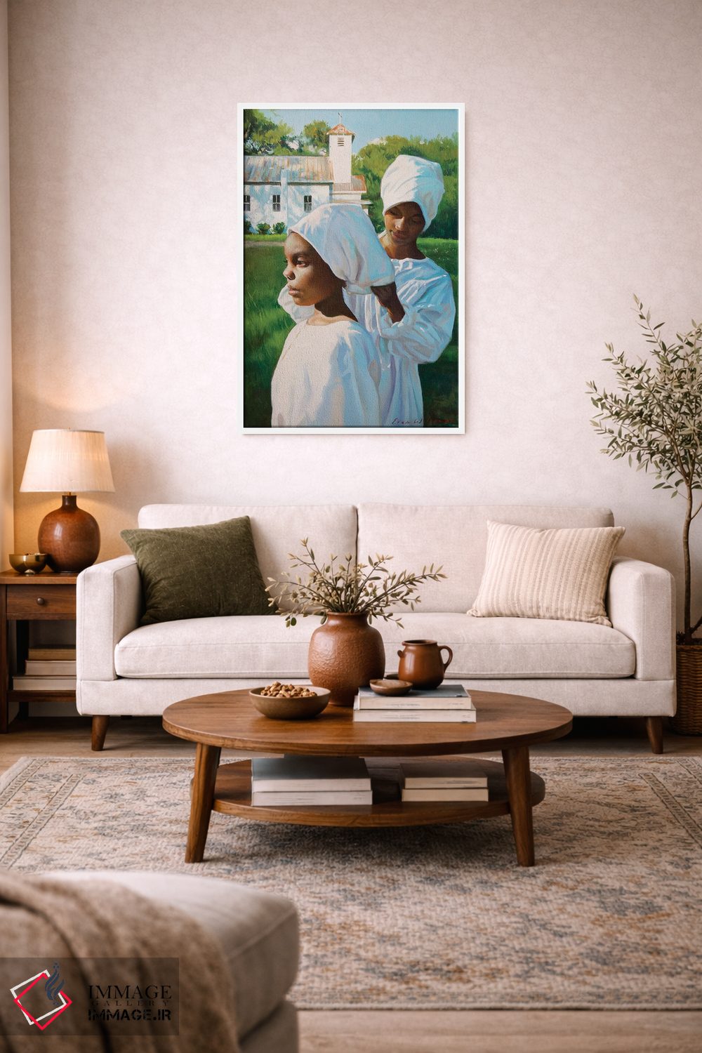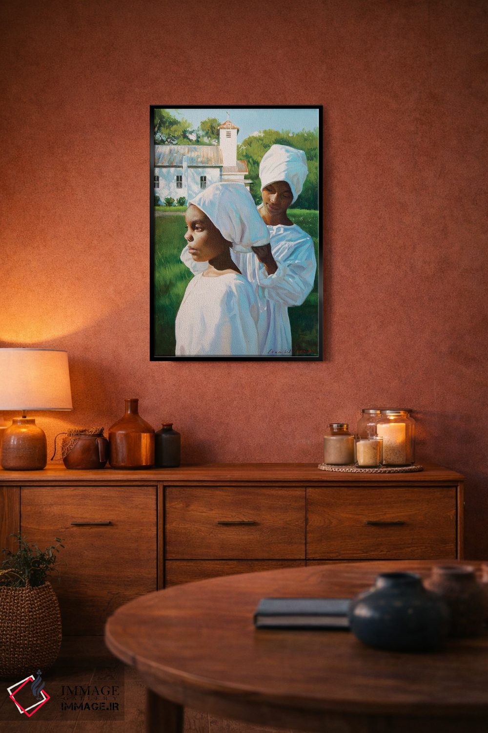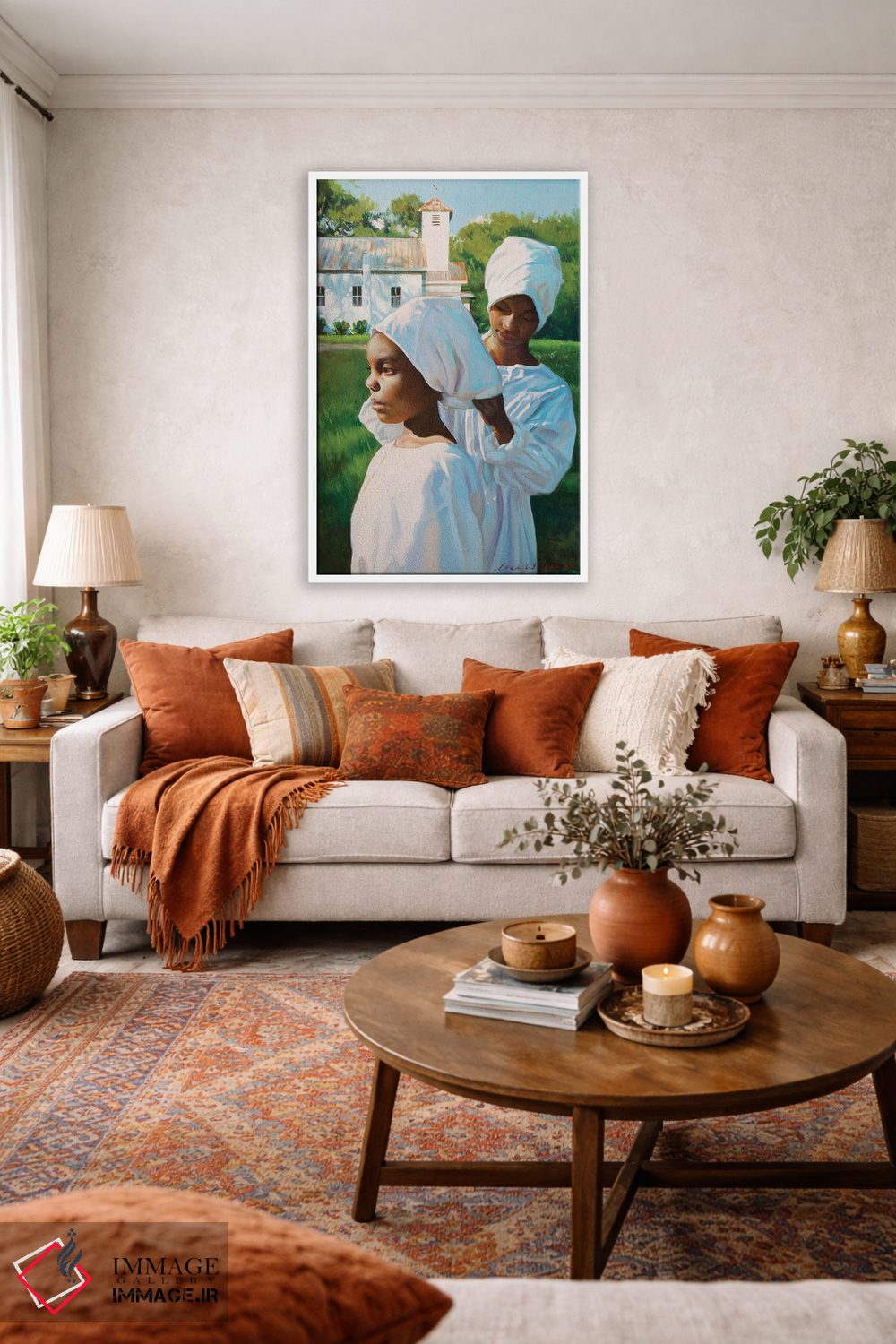 براساس پالت ترکیبی اثر، قاب تیک گرم (چوبی) پیشنهاد اول است و مشکی مات (فریم متوسط) مکمل. برای سفارشهای پروژهای با ابعاد و قابهای اختصاصی با ایماژ در تماس باشید.