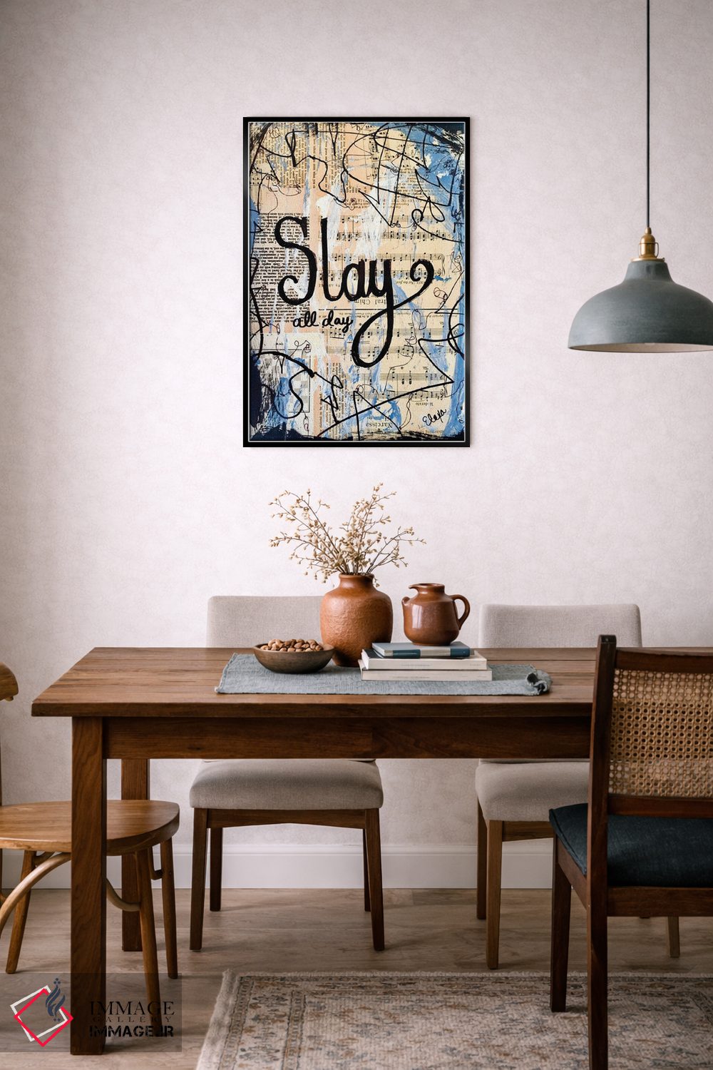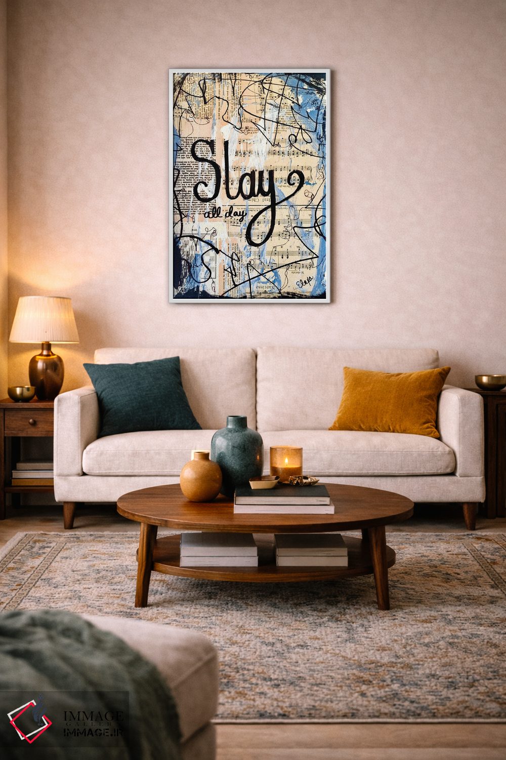 براساس پالت ترکیبی اثر، قاب بلوط روشن (چوبی) پیشنهاد اول است و استخوانی ملایم مکمل. برای سفارشهای پروژهای با ابعاد و قابهای اختصاصی با ایماژ در تماس باشید.