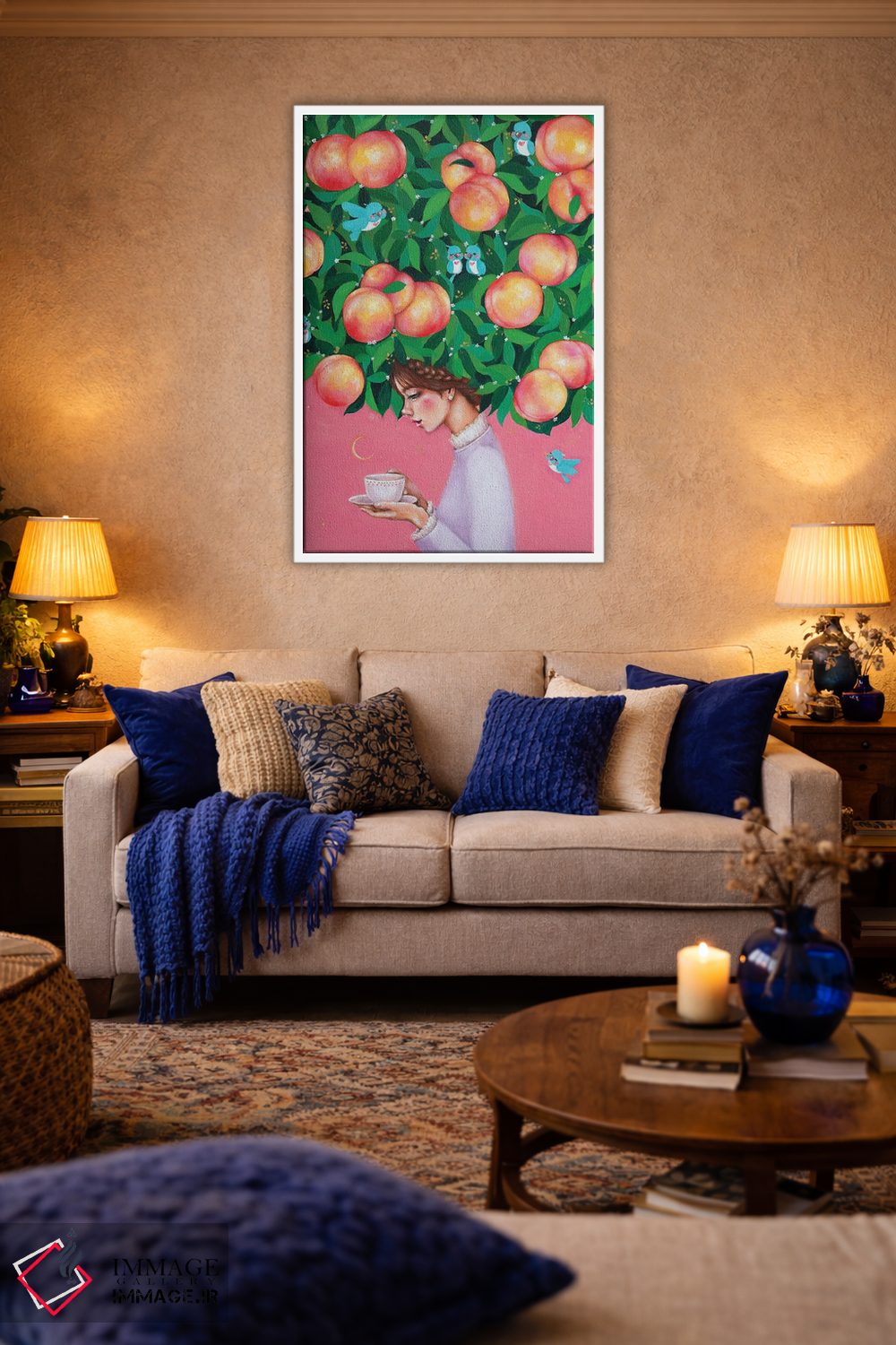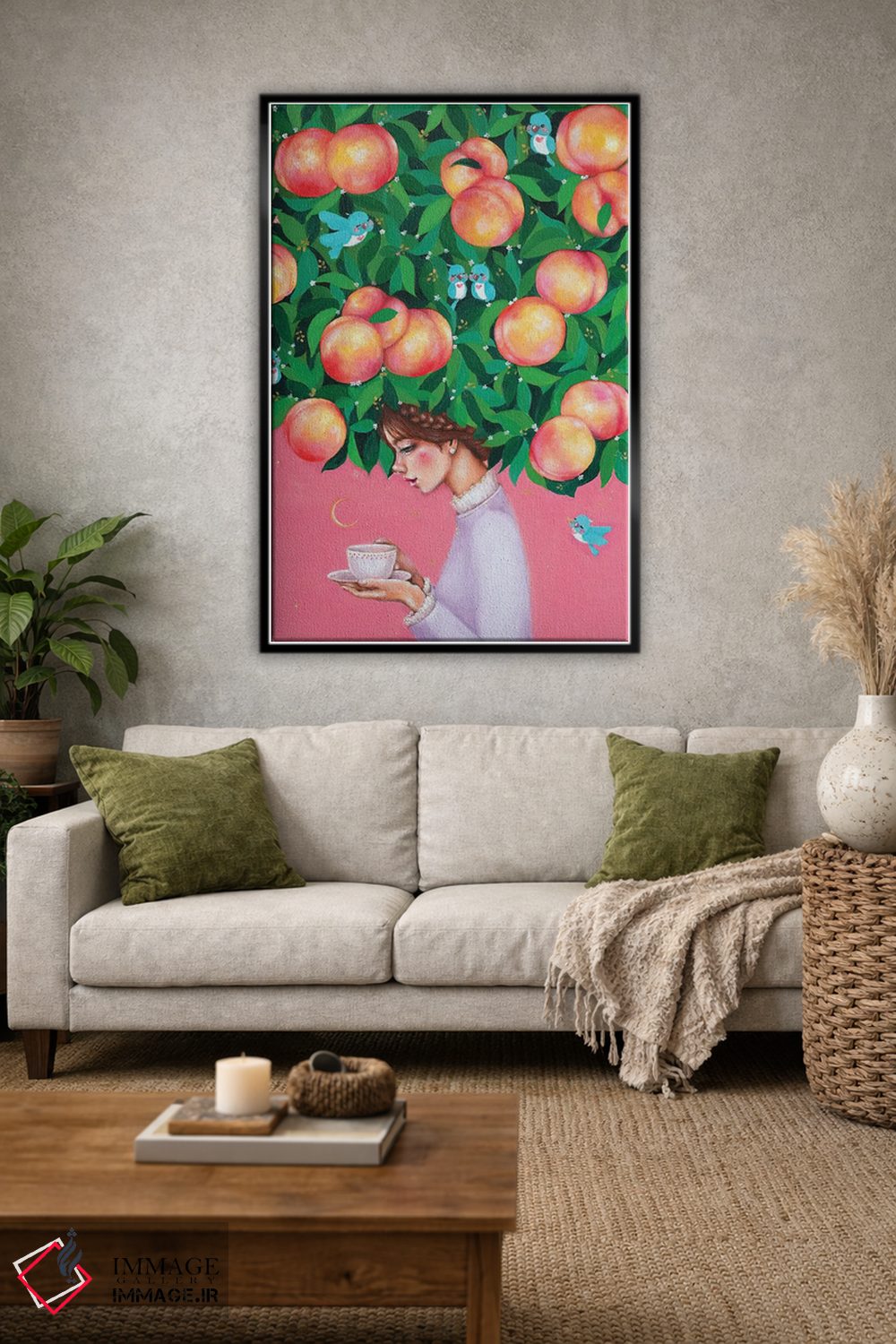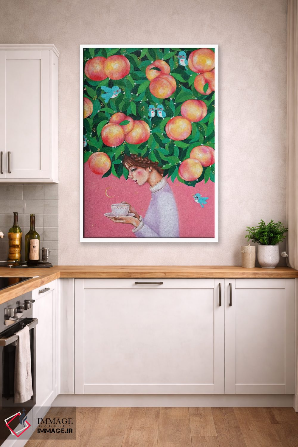 برای دکورهای صمیمی، «زمان چای هلو» اثرِ «یوری کیم» در کنار رنگهای خنثی، تضاد دلچسبی میسازد؛ برای خانههایی با چوب و پارچههای گرم انتخابی خوشسلیقه است. به دیوار، قصه میدهد—اما قصهای آرام و شیک.