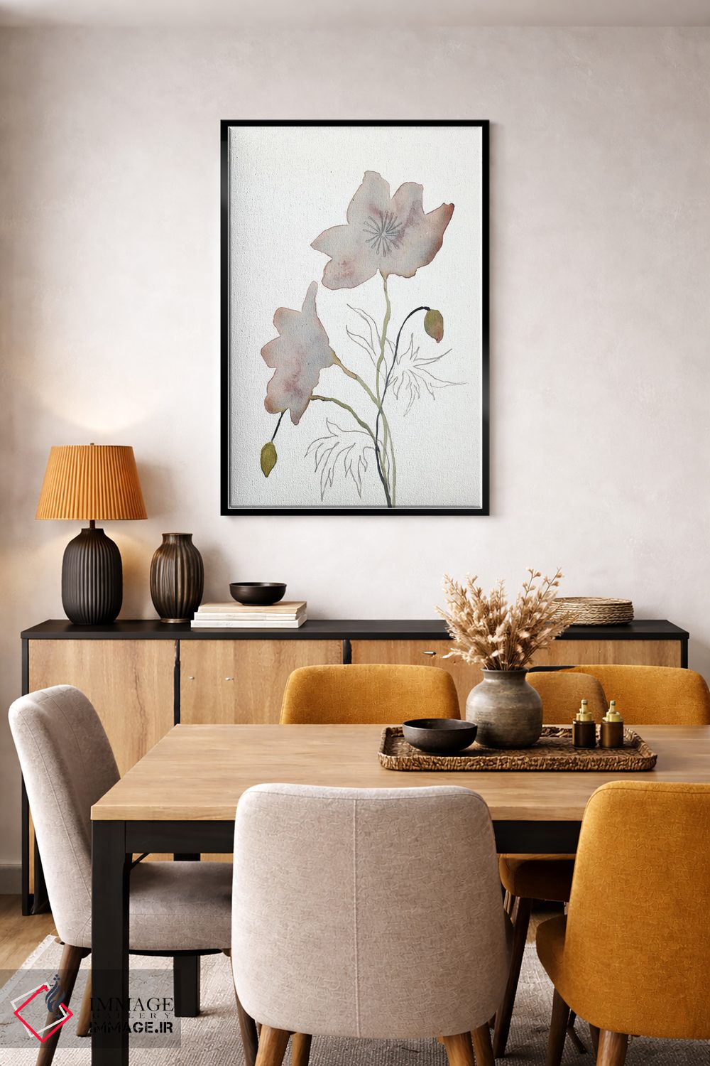 براساس پالت گرم اثر، قاب تیک گرم (چوبی) پیشنهاد اول است و مشکی مات (فریم متوسط) مکمل. برای سفارشهای پروژهای با ابعاد و قابهای اختصاصی با ایماژ در تماس باشید.