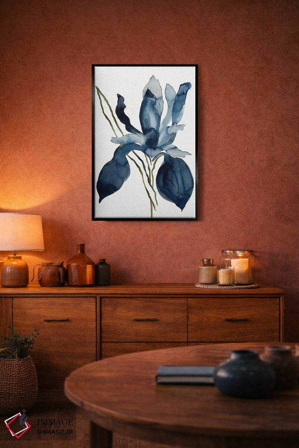 برای یک چیدمان تمیز، آبی را در یک تابلو کوچک مکمل برگردانید تا رنگها در فضا نفس بکشند. انتخاب قاب هم میتواند این اکسنت را تقویت کند.