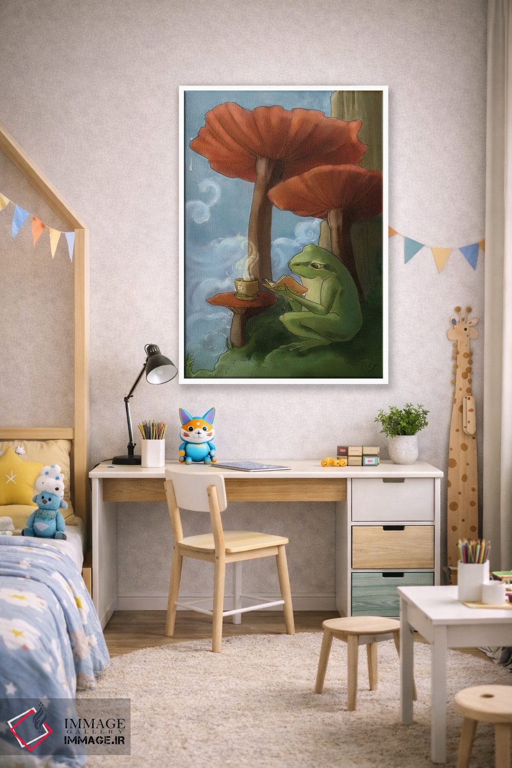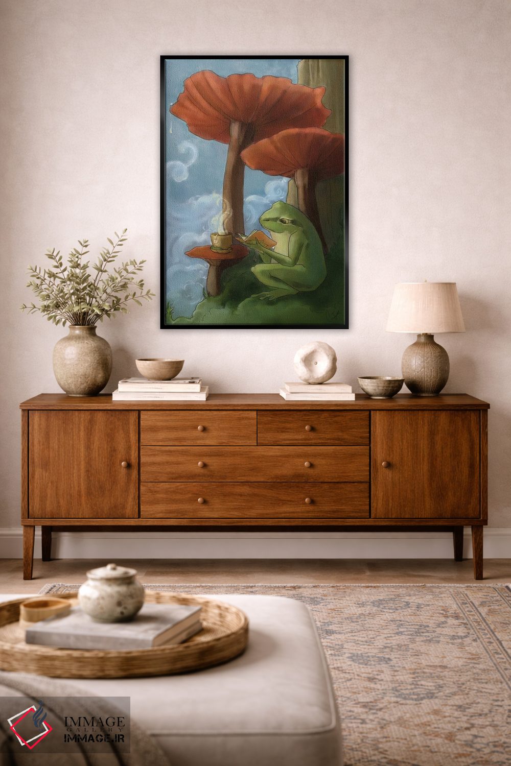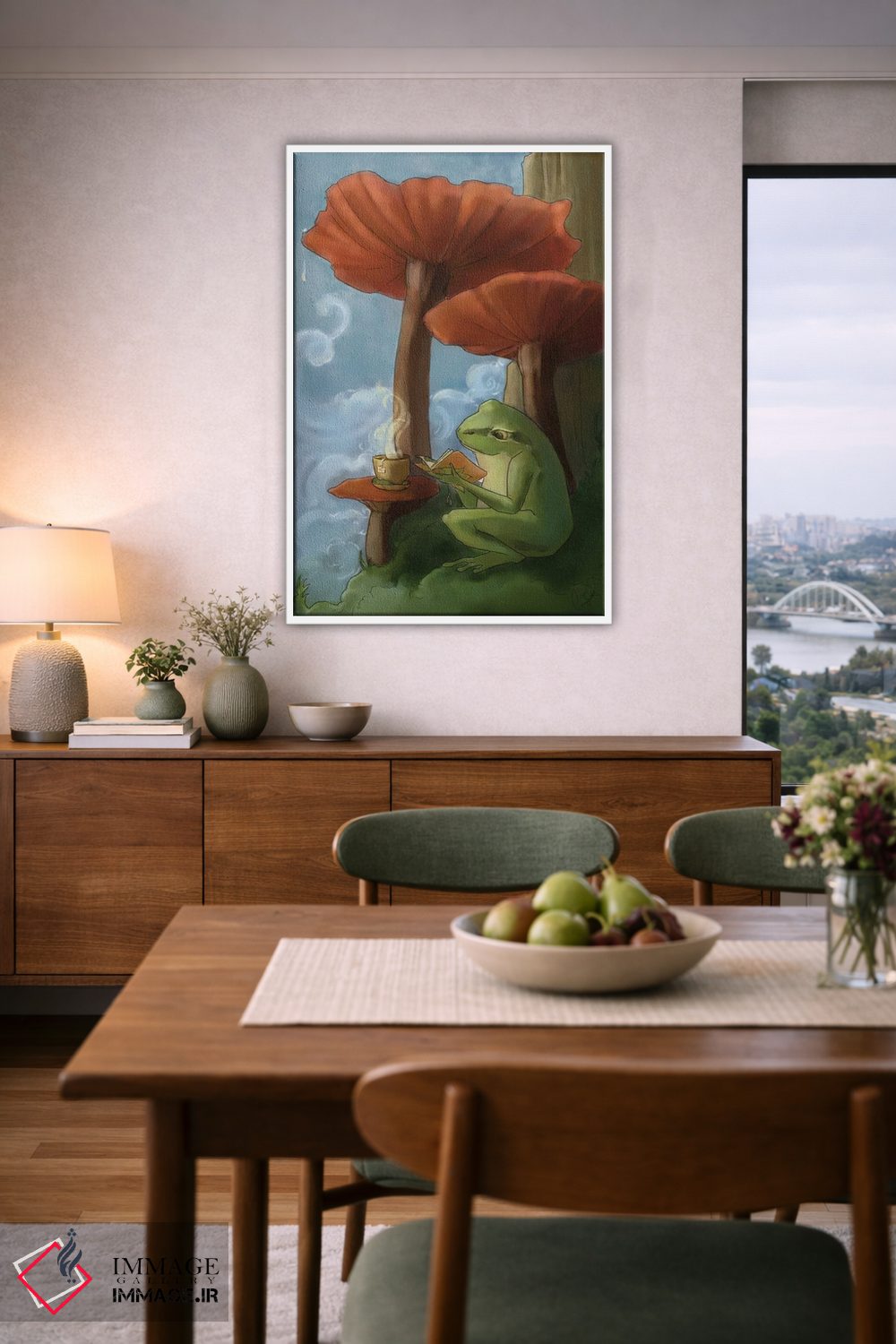 در این اثر، «قورباغه درختی اورگن» اثرِ «مایت فلای آرت اند ایلاستریشن (استودیو طراحی و تصویرگری)» چیدمان را از حالت پراکنده خارج میکند؛ برای دیوار بالای کنسول یا شومینه پیشنهاد میشود. به فضا حس «گالری خانگی» میدهد، بدون اینکه اغراق کند.