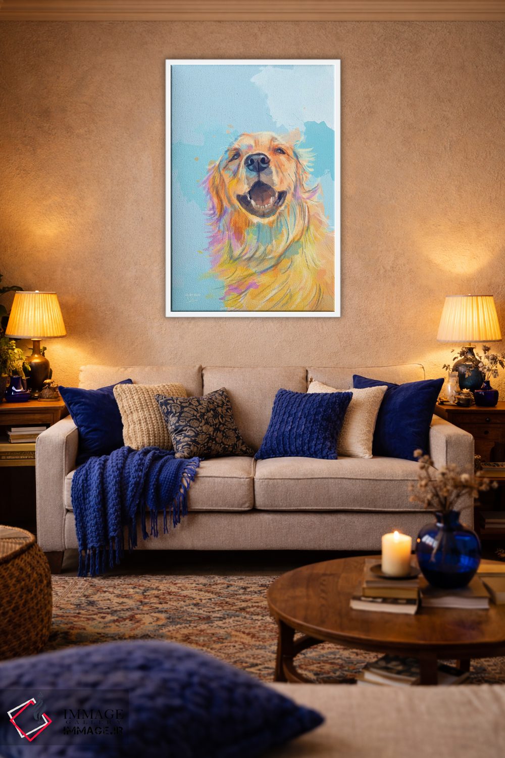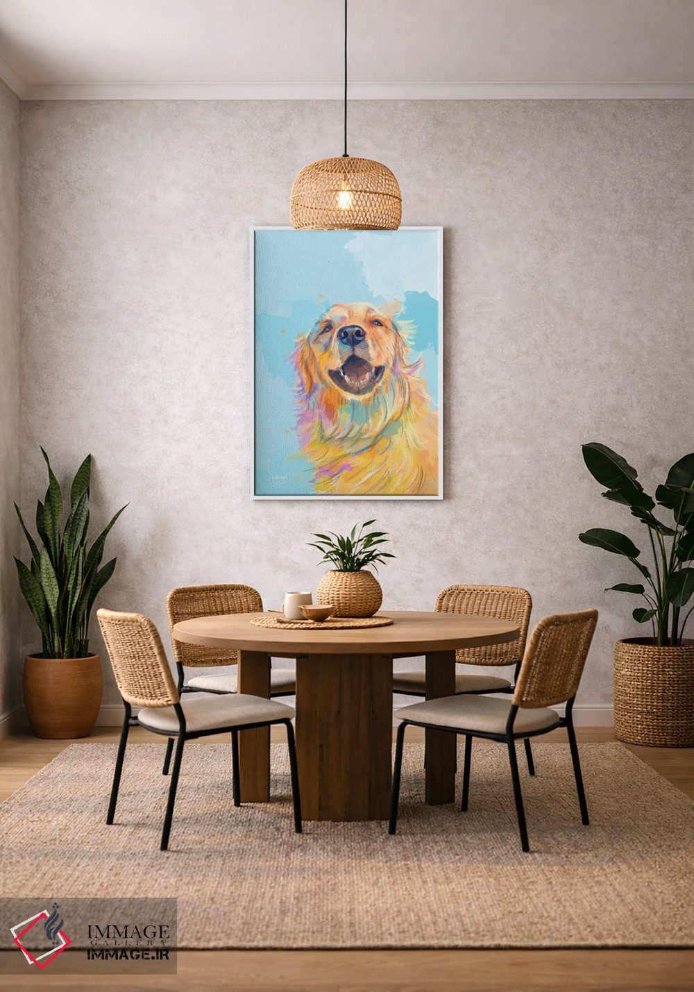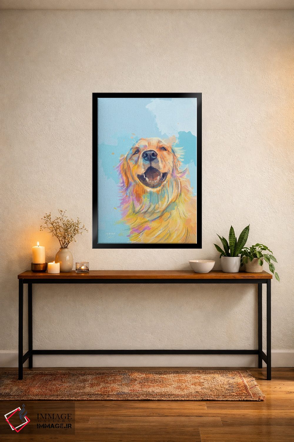 اگر میخواهید دیوار کمی سرزندگیِ محترمانه داشته باشد، «لبخند طلایی—پرترهٔ گلدن رتریور» اثرِ «فلو آرت استودیو (استودیوی هنری)» مثل یک امضای بامزه اما متین عمل میکند، برای راهروها و ورودیهای گرم گزینهٔ مناسبیست. برای دیوار گالریوار هم گزینهٔ خوبیست.