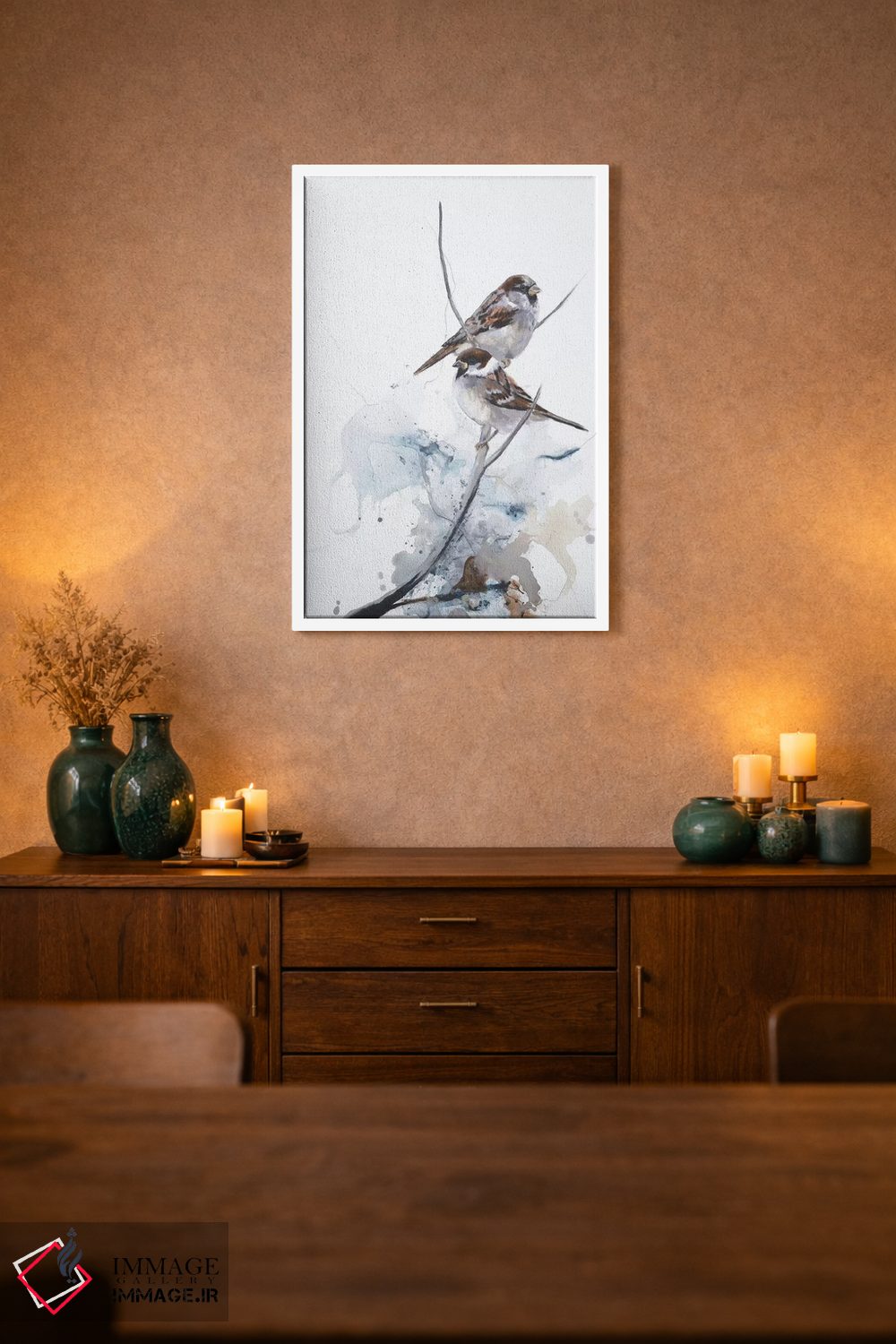 براساس پالت گرم اثر، قاب تیک گرم (چوبی) پیشنهاد اول است و مشکی مات (فریم متوسط) مکمل. برای سفارشهای پروژهای با ابعاد و قابهای اختصاصی با ایماژ در تماس باشید.