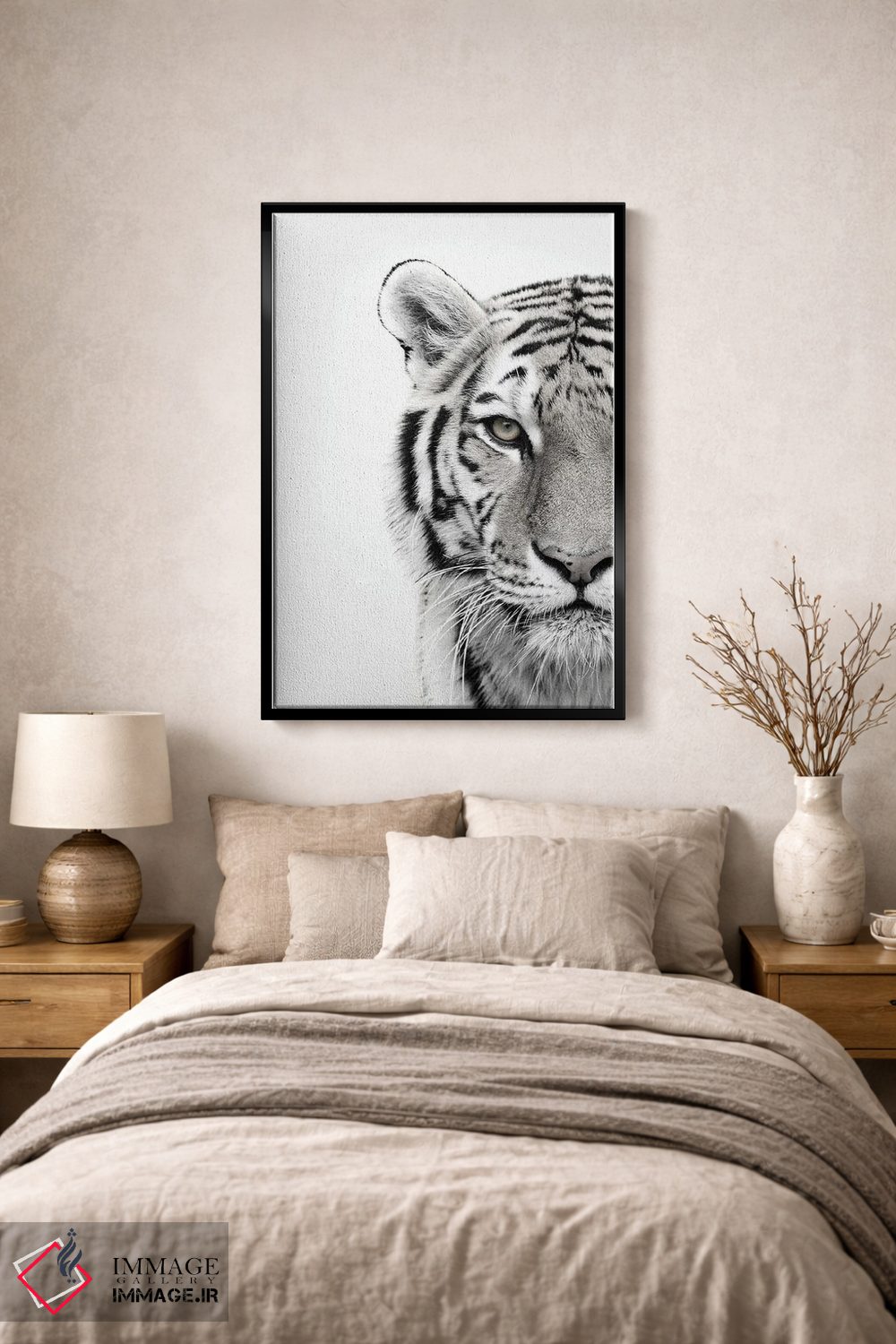 براساس پالت خنثی اثر، قاب مشکی مات (فریم باریک) پیشنهاد اول است و سفید مات (فریم باریک) مکمل. برای سفارشهای پروژهای با ابعاد و قابهای اختصاصی با ایماژ در تماس باشید.