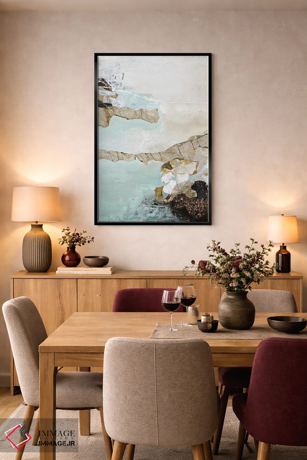 براساس پالت گرم اثر، قاب بلوط روشن (چوبی) پیشنهاد اول است و استخوانی ملایم مکمل. برای سفارشهای پروژهای با ابعاد و قابهای اختصاصی با ایماژ در تماس باشید.