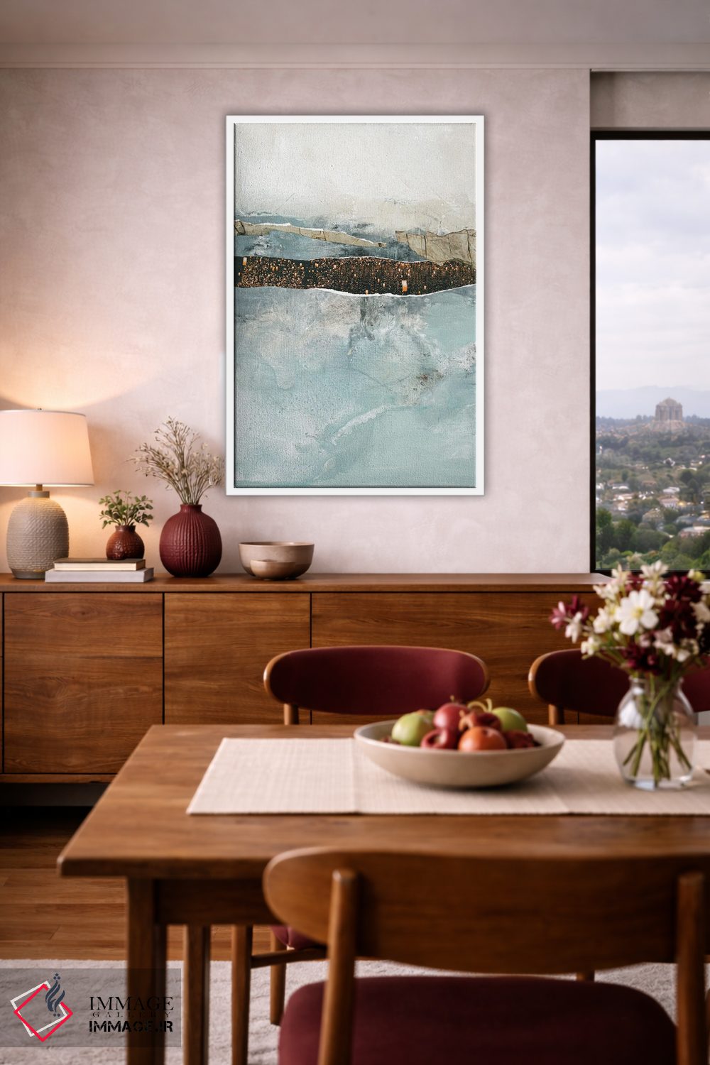 براساس پالت گرم اثر، قاب بلوط روشن (چوبی) پیشنهاد اول است و استخوانی ملایم مکمل. برای سفارشهای پروژهای با ابعاد و قابهای اختصاصی با ایماژ در تماس باشید.