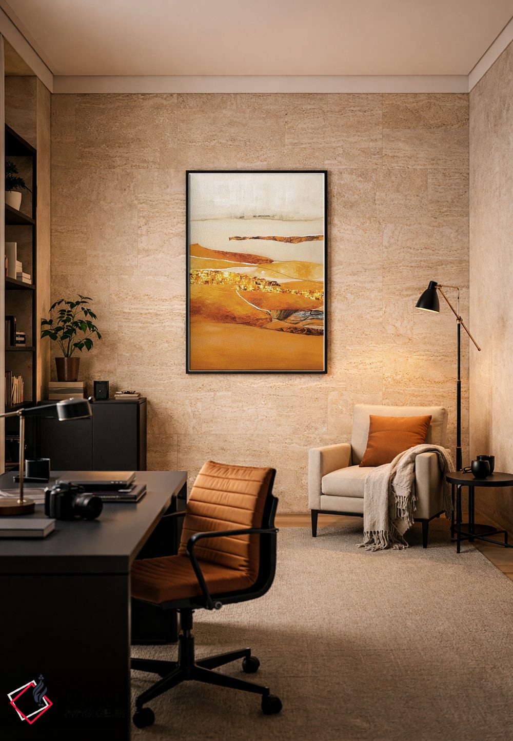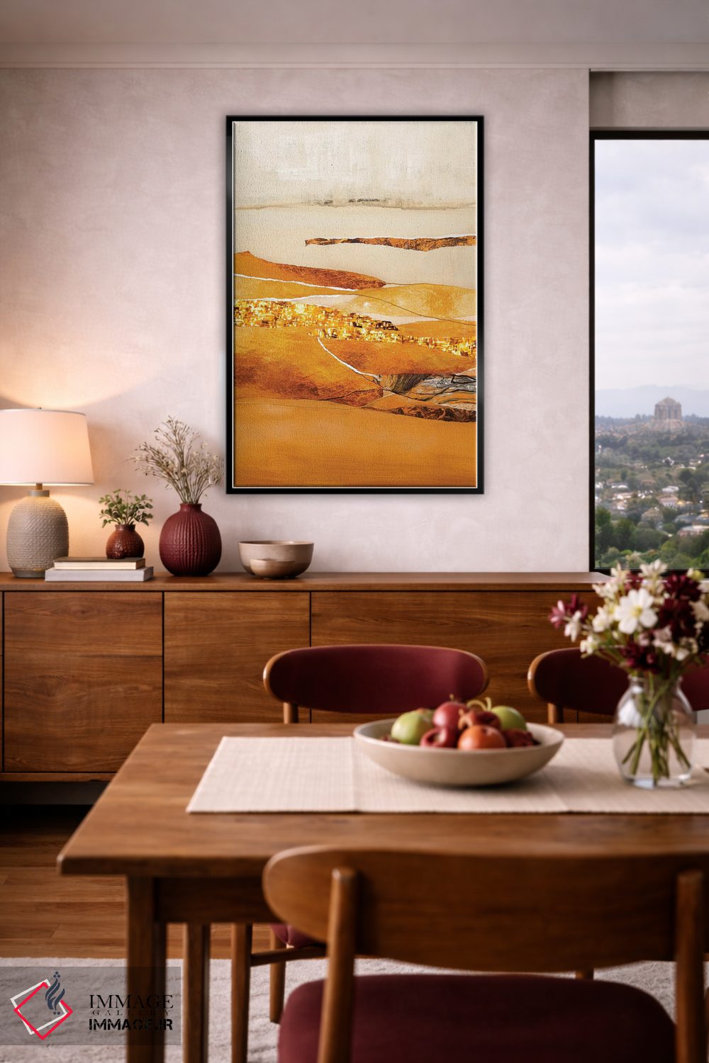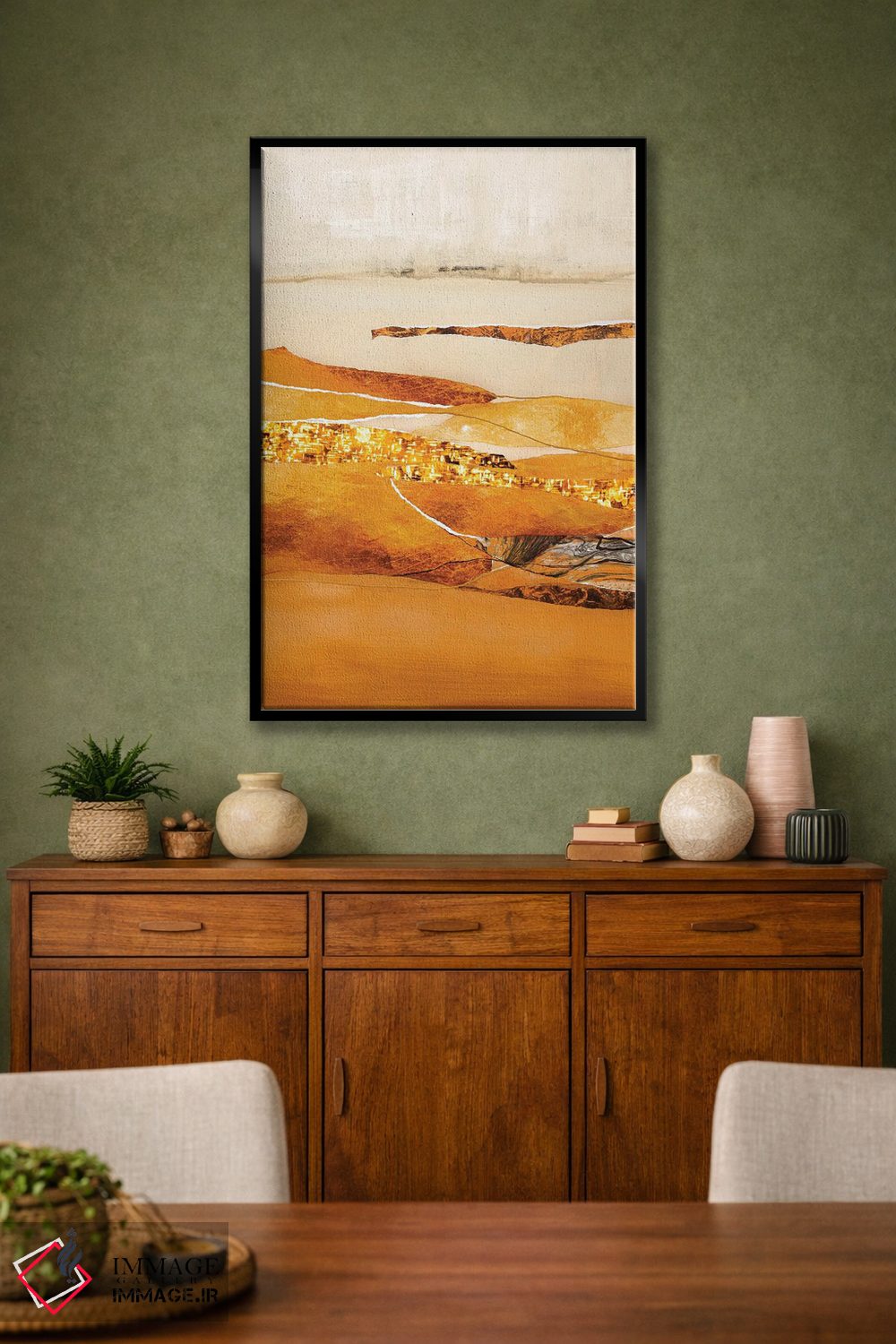 براساس پالت گرم اثر، قاب بلوط روشن (چوبی) پیشنهاد اول است و استخوانی ملایم مکمل. برای سفارشهای پروژهای با ابعاد و قابهای اختصاصی با ایماژ در تماس باشید.