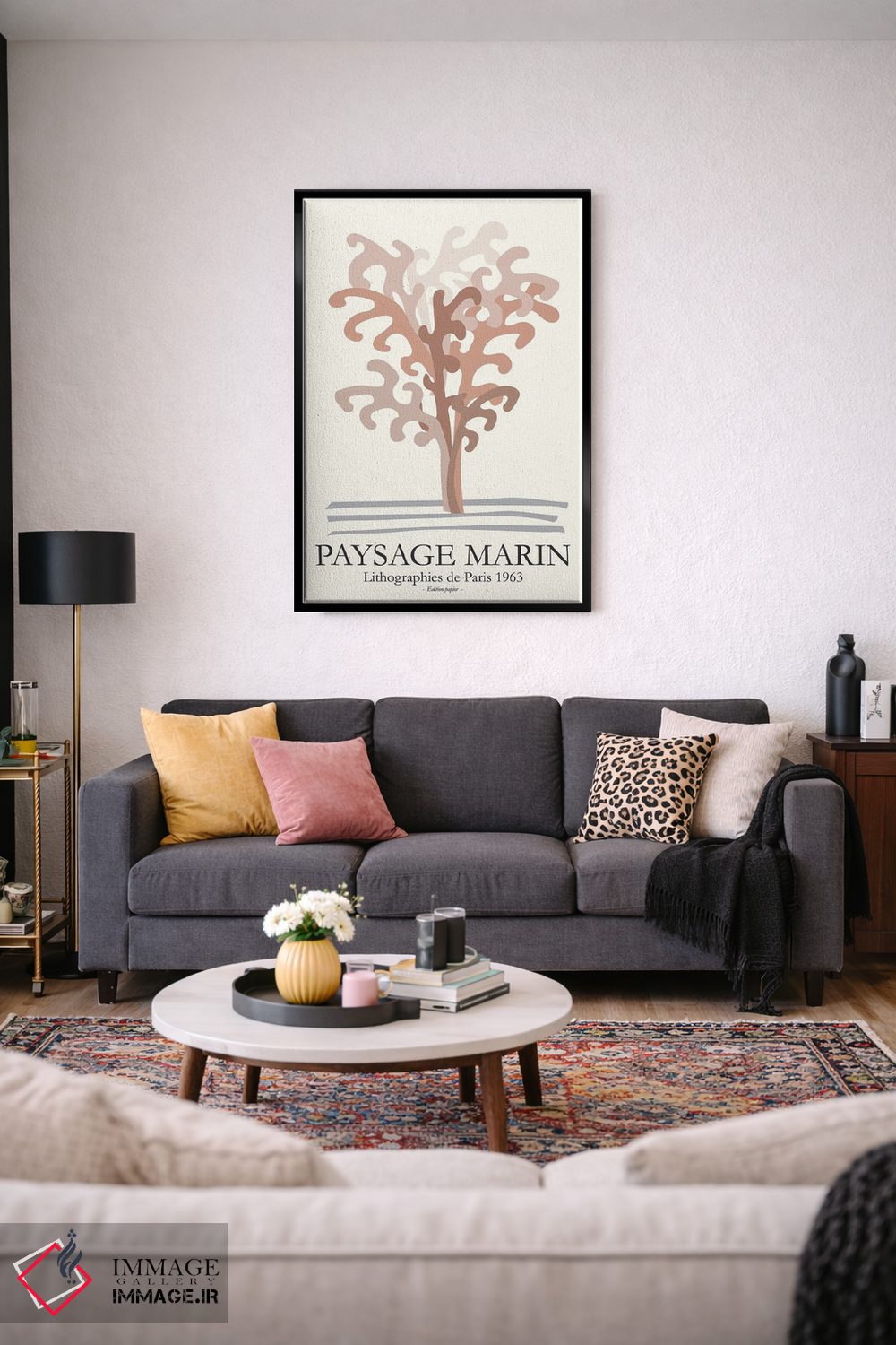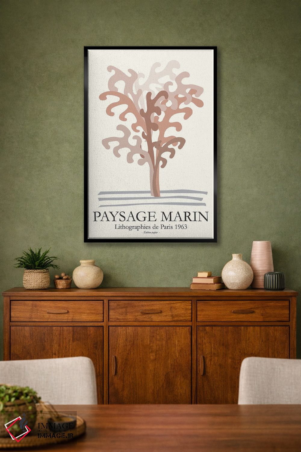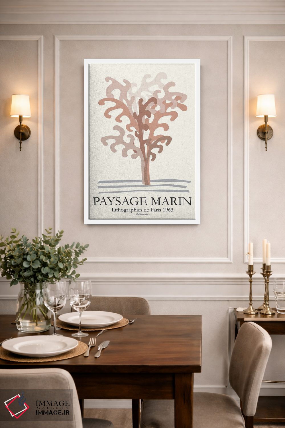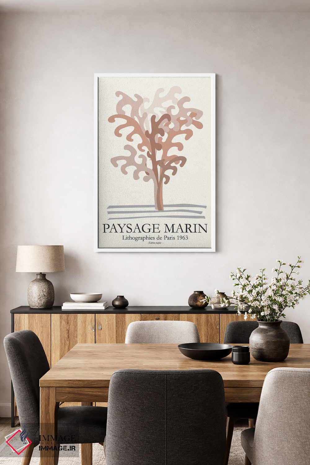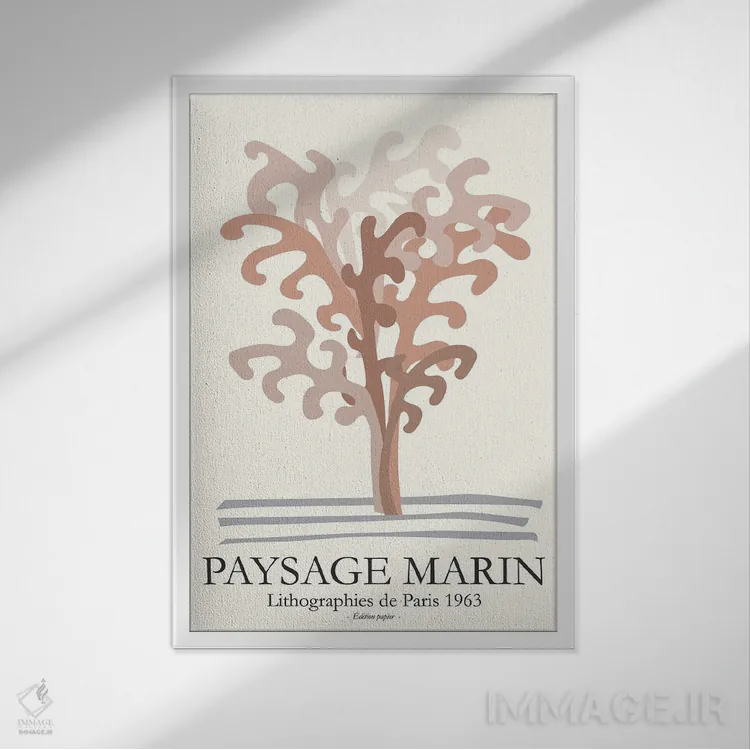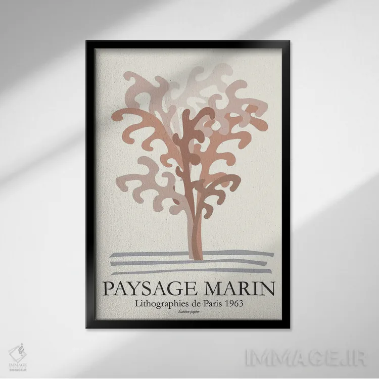 براساس پالت گرم اثر، قاب بلوط روشن (چوبی) پیشنهاد اول است و استخوانی ملایم مکمل. برای سفارشهای پروژهای با ابعاد و قابهای اختصاصی با ایماژ در تماس باشید.