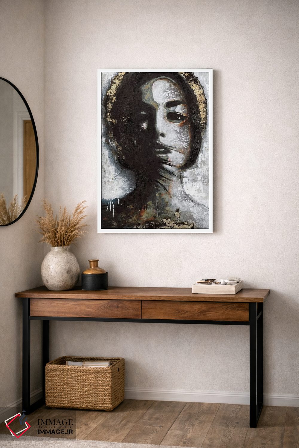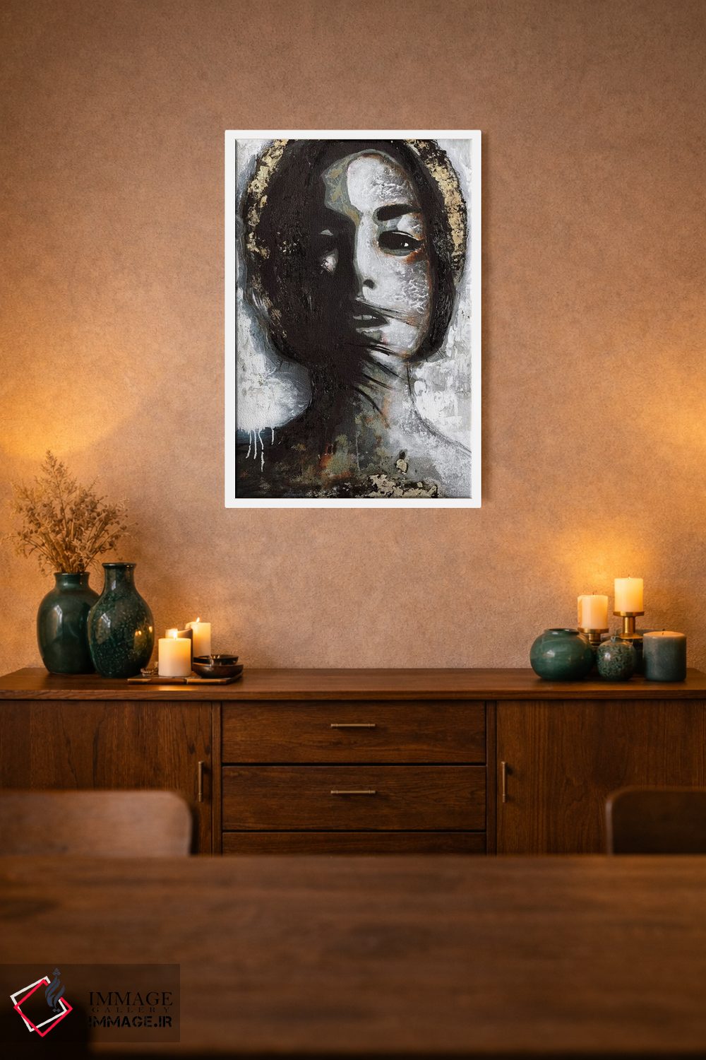 براساس پالت گرم اثر، قاب بلوط روشن (چوبی) پیشنهاد اول است و استخوانی ملایم مکمل. برای سفارشهای پروژهای با ابعاد و قابهای اختصاصی با ایماژ در تماس باشید.