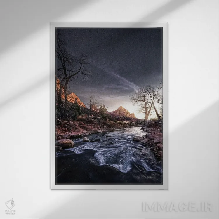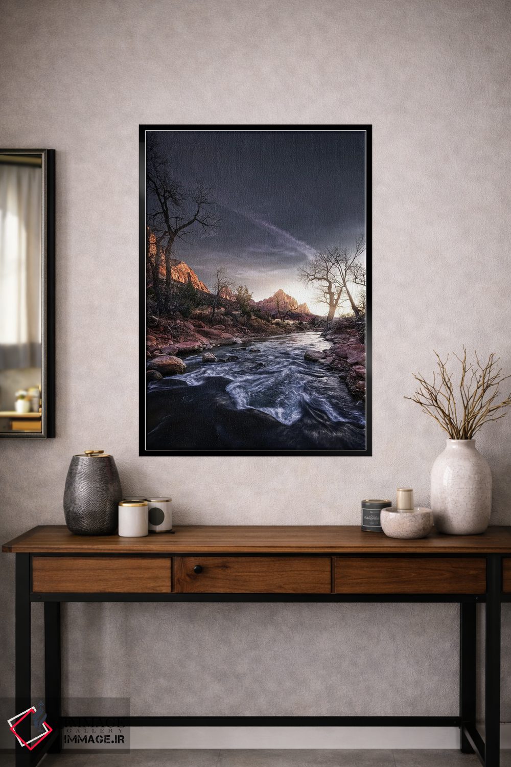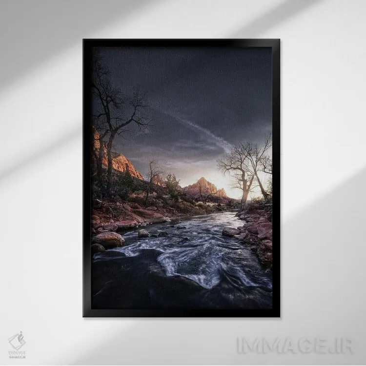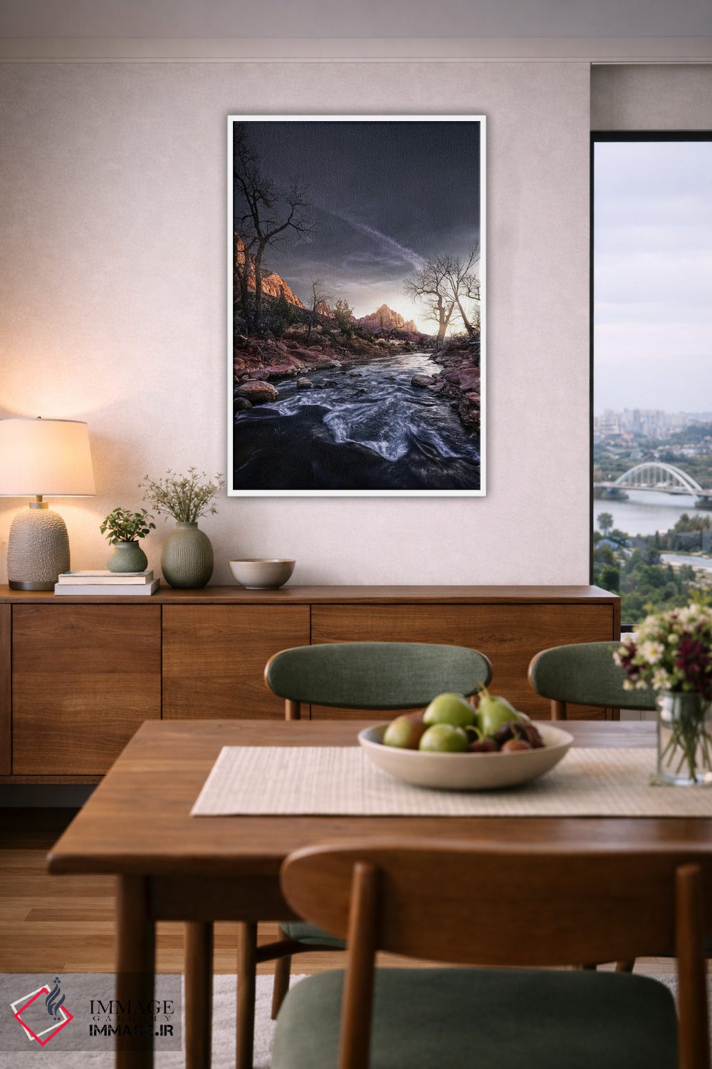 براساس پالت ترکیبی اثر، قاب تیک گرم (چوبی) پیشنهاد اول است و مشکی مات (فریم متوسط) مکمل. برای سفارشهای پروژهای با ابعاد و قابهای اختصاصی با ایماژ در تماس باشید.