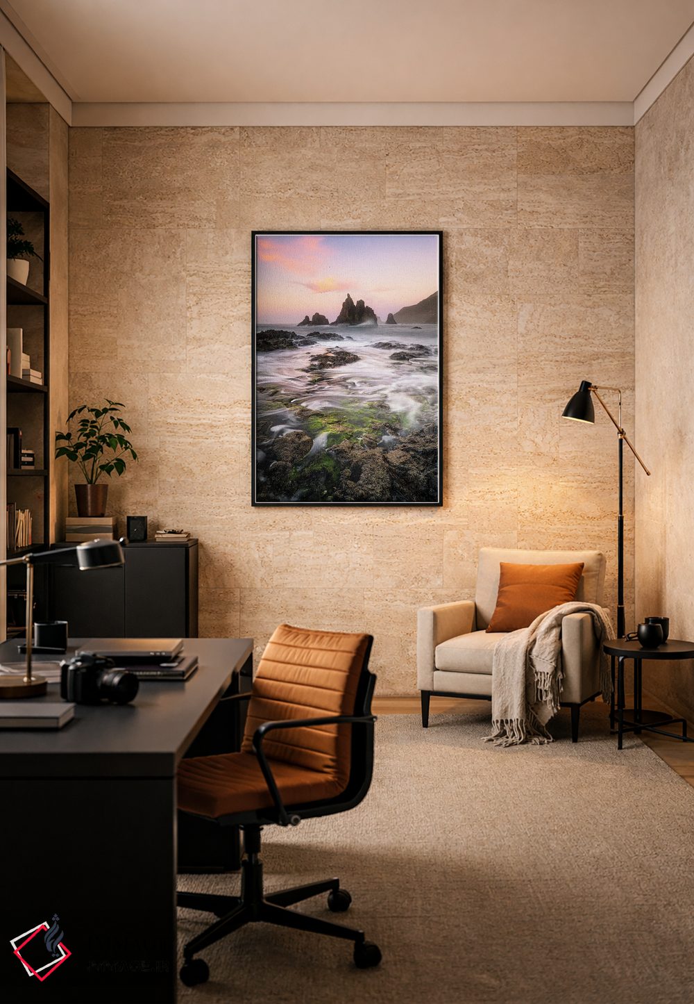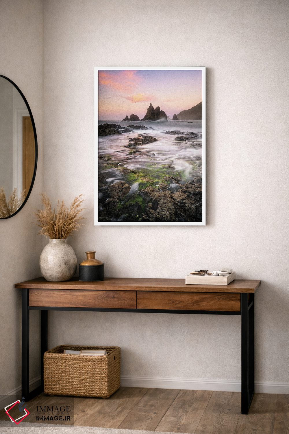 براساس پالت گرم اثر، قاب بلوط روشن (چوبی) پیشنهاد اول است و استخوانی ملایم مکمل. برای سفارشهای پروژهای با ابعاد و قابهای اختصاصی با ایماژ در تماس باشید.
