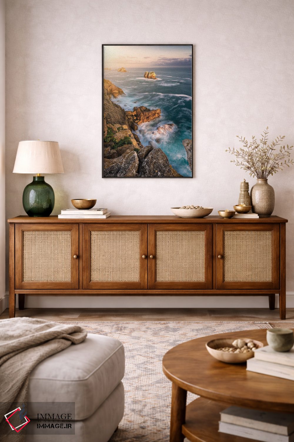 براساس پالت ترکیبی اثر، قاب بلوط روشن (چوبی) پیشنهاد اول است و استخوانی ملایم مکمل. برای سفارشهای پروژهای با ابعاد و قابهای اختصاصی با ایماژ در تماس باشید.