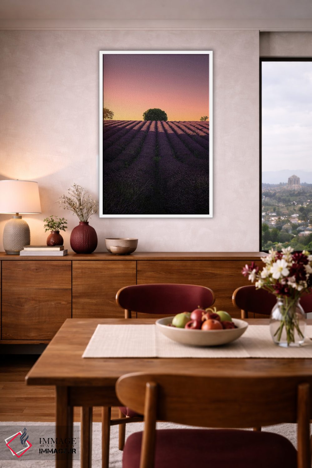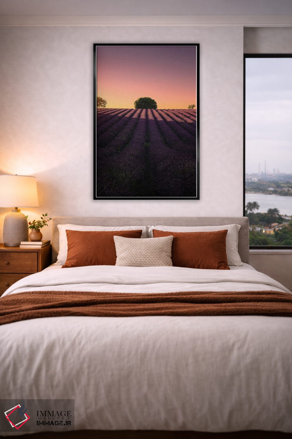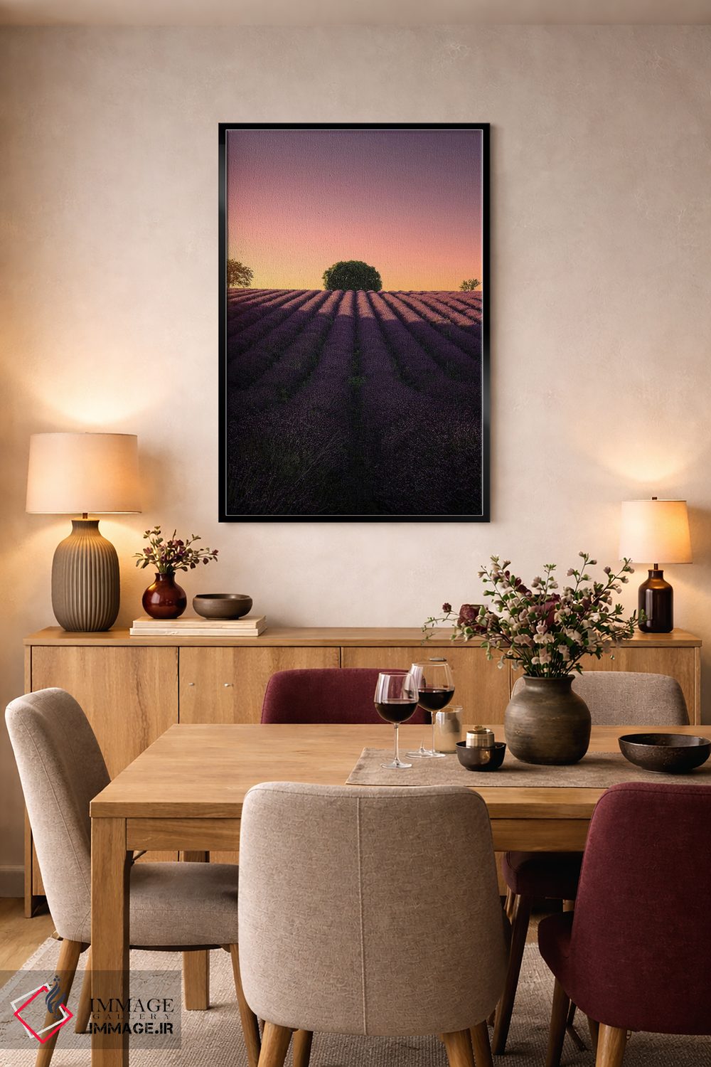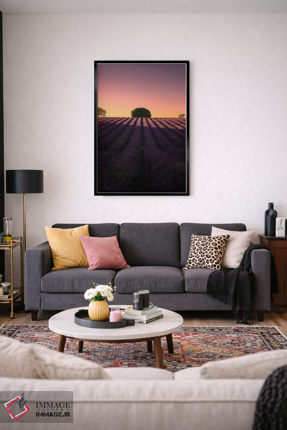 بوم گالری ایماژ طوری طراحی شده که اثر روی دیوار «پرداختشده» و حرفهای دیده شود—نه پرزرقوبرقِ بیپایه؛ بلکه دقیق و خوشپرداخت. بافت ظریف کنواس کمک میکند حس اثر هنری را در نگاه نزدیک نگه میدارد. کنترل تونها کمک میکند از تند شدن ناخواستهی رنگها جلوگیری میکند. حاصل کار، یک تابلو خوشنشین است که هم از دور اثرگذار است و هم از نزدیک خوشخوان؛ همراهِ نورپردازی درست، جلوهی گالریوار بیشتری حس میشود. در کنار چوب و متریالهای طبیعی، بافت کنواس دلنشینتر دیده میشود.