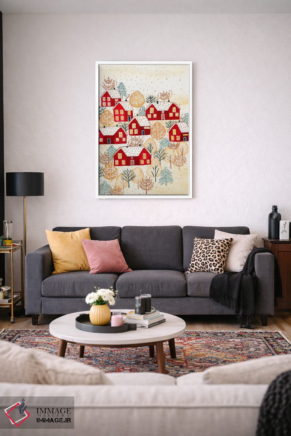 «روستای طلایی زمستانی» اثرِ «افانکی دیزاینز (استودیو طراحی)» با ریتمِ بصریِ منظم و لطیف، میتواند بهخوبی کنار مبلمان ساده و رنگهای خنثی بنشیند.