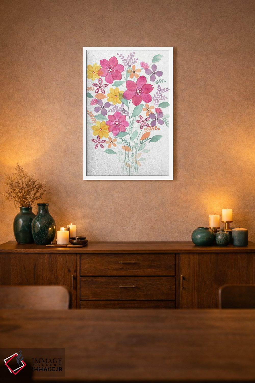 براساس پالت گرم اثر، قاب تیک گرم (چوبی) پیشنهاد اول است و مشکی مات (فریم متوسط) مکمل. برای سفارشهای پروژهای با ابعاد و قابهای اختصاصی با ایماژ در تماس باشید.