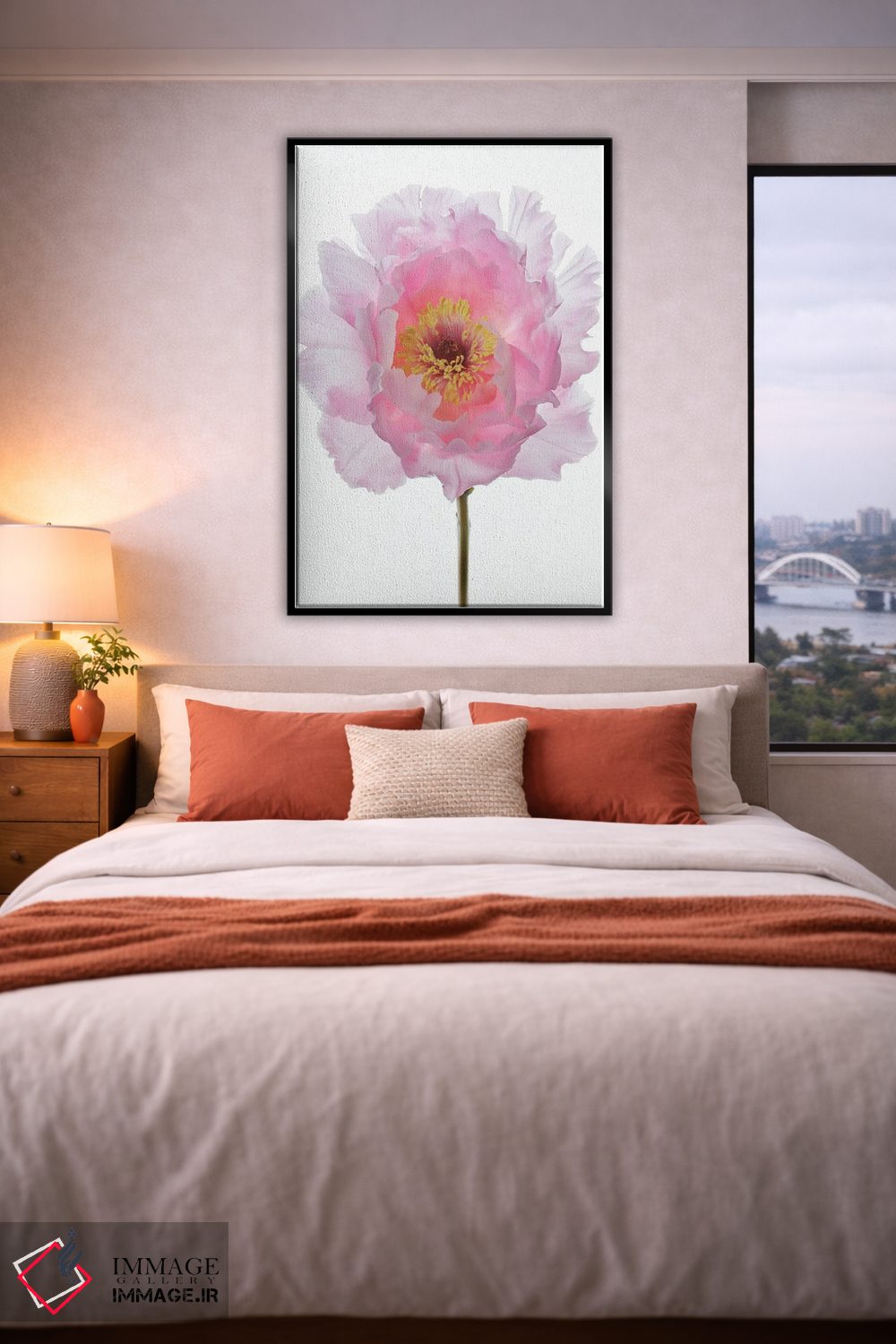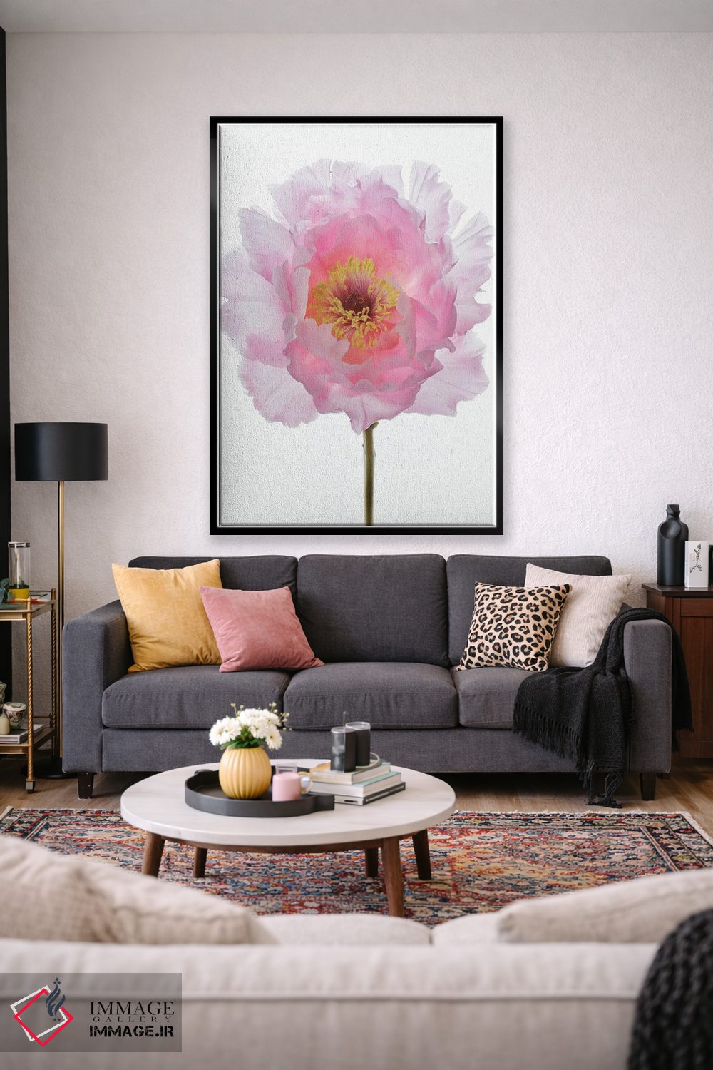 تابلو مدرن گل صدتومانی درختی صورتی اثر آلیسون فنل - نمای روبه‌رو روی دیوار