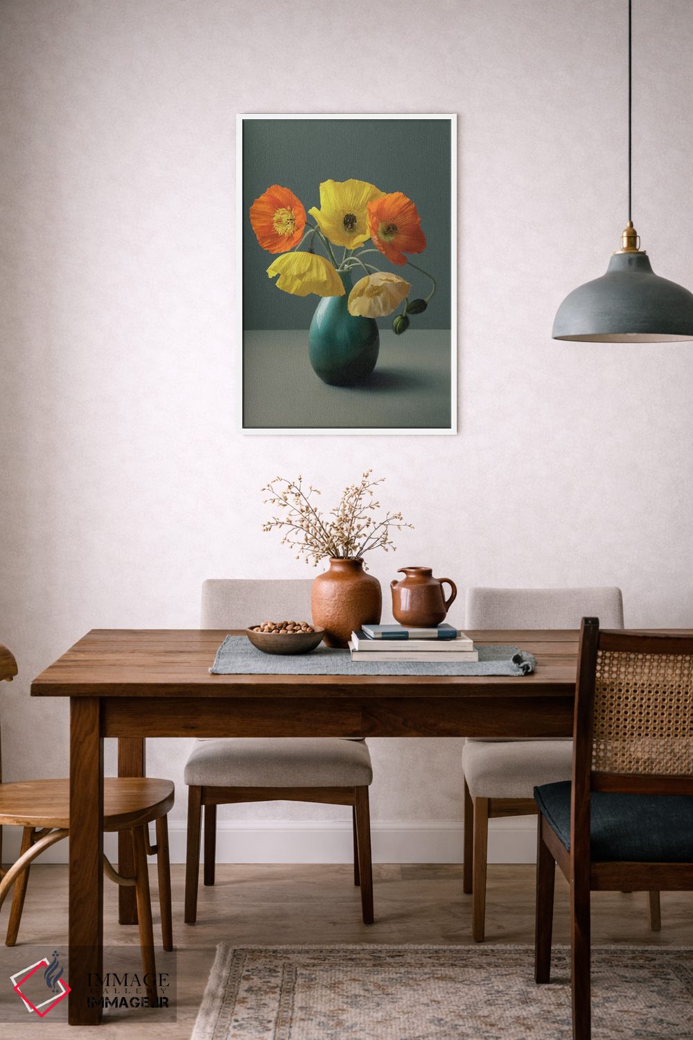 «طبیعت بیجان خشخاش ایسلندی» اثرِ «آلیسون فنل» مثل یک نفس تازه است؛ حس فصل را آرام وارد فضا میکند؛ برای فضای غذاخوری انتخابی خوشسلیقه است. با قاب روشن یا چوبی، حس طبیعیتری پیدا میکند.
