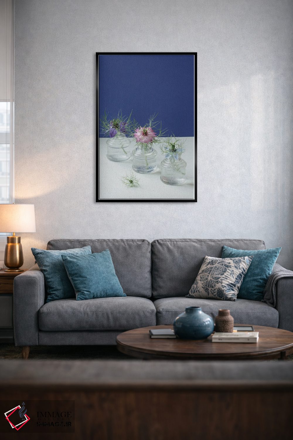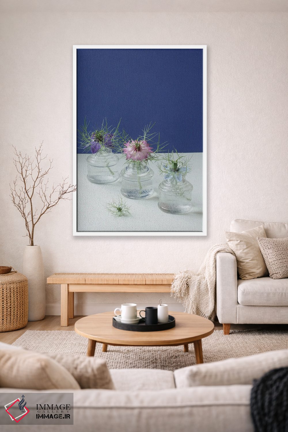 تابلو دکوراتیو طبیعت بی جان گل های نایجلا اثر آلیسون فنل - نمای روبه‌رو روی دیوار