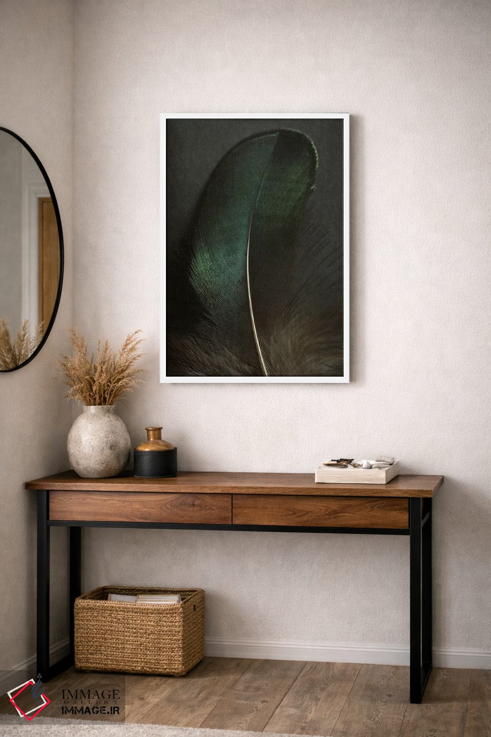براساس پالت خنثی اثر، قاب بلوط روشن (چوبی) پیشنهاد اول است و استخوانی ملایم مکمل. برای سفارشهای پروژهای با ابعاد و قابهای اختصاصی با ایماژ در تماس باشید.