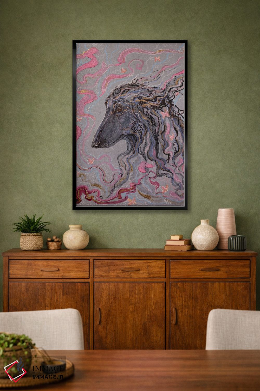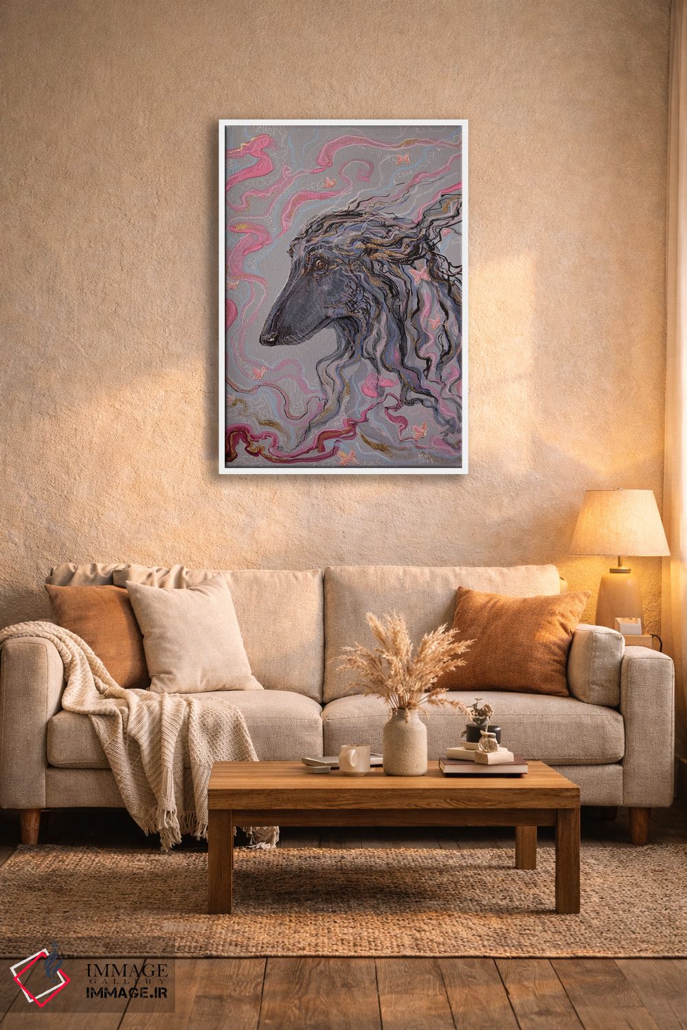 براساس پالت گرم اثر، قاب تیک گرم (چوبی) پیشنهاد اول است و مشکی مات (فریم متوسط) مکمل. برای سفارشهای پروژهای با ابعاد و قابهای اختصاصی با ایماژ در تماس باشید.