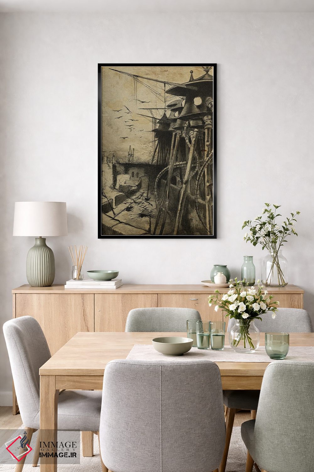 براساس پالت گرم اثر، قاب بلوط روشن (چوبی) پیشنهاد اول است و استخوانی ملایم مکمل. برای سفارشهای پروژهای با ابعاد و قابهای اختصاصی با ایماژ در تماس باشید.