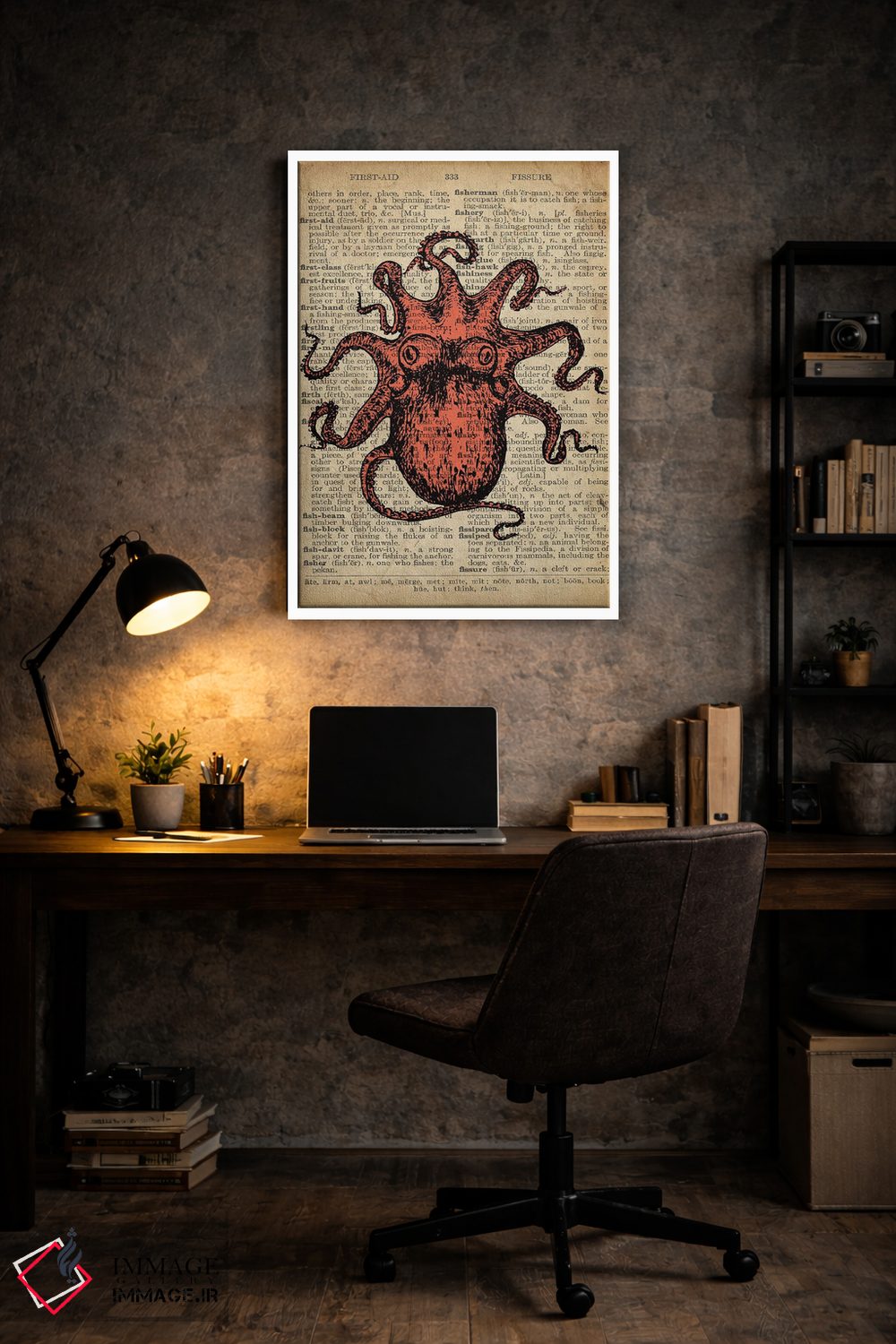 این اثر با عنوان «هیولای دریایی (دریانوردی)» اثرِ «فیشِرکرافت (استودیوی خلاقانه)» در کنار رنگهای خنثی، تضاد دلچسبی میسازد؛ برای کافههای کوچک و صمیمی انتخابی خوشسلیقه است. با نورپردازی نقطهای، جذابتر هم میشود.