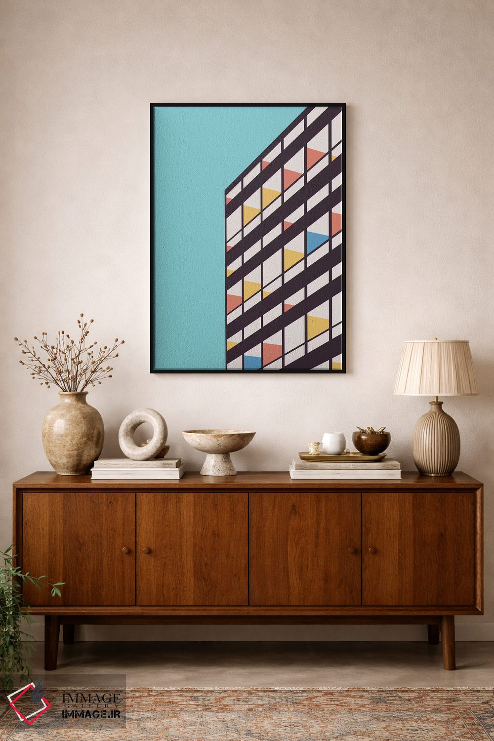 براساس پالت ترکیبی اثر، قاب تیک گرم (چوبی) پیشنهاد اول است و مشکی مات (فریم متوسط) مکمل. برای سفارشهای پروژهای با ابعاد و قابهای اختصاصی با ایماژ در تماس باشید.