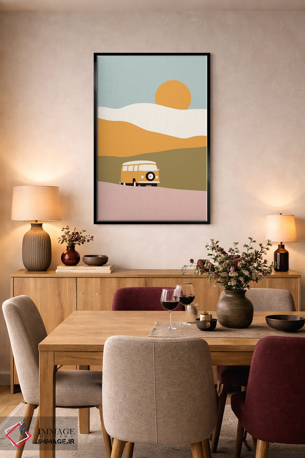 براساس پالت گرم اثر، قاب تیک گرم (چوبی) پیشنهاد اول است و مشکی مات (فریم متوسط) مکمل. برای سفارشهای پروژهای با ابعاد و قابهای اختصاصی با ایماژ در تماس باشید.